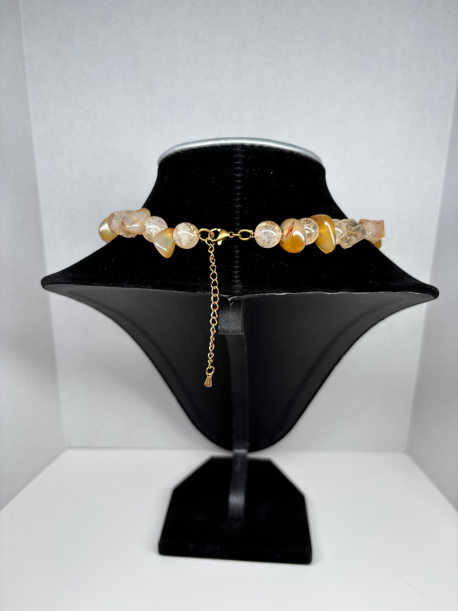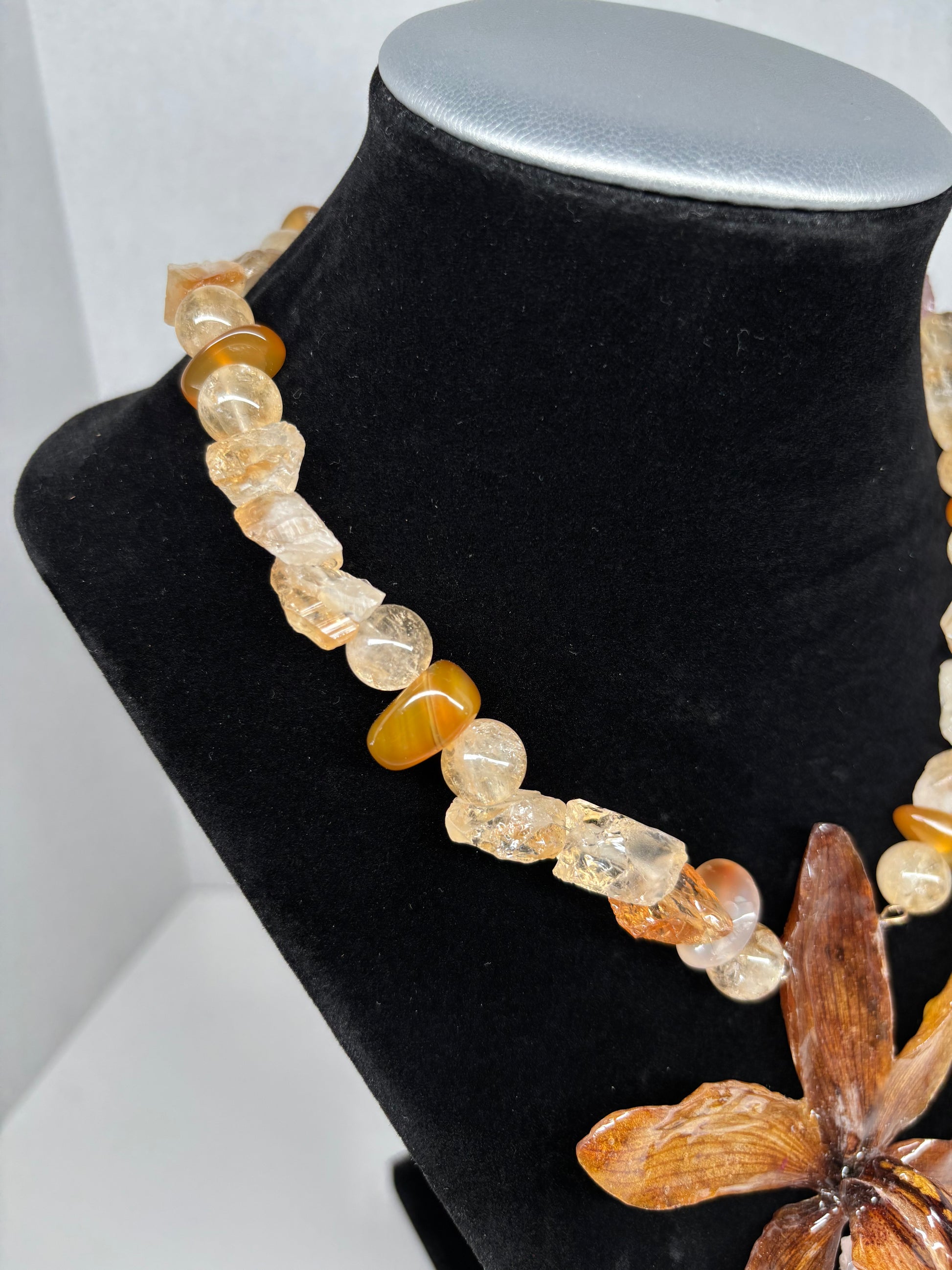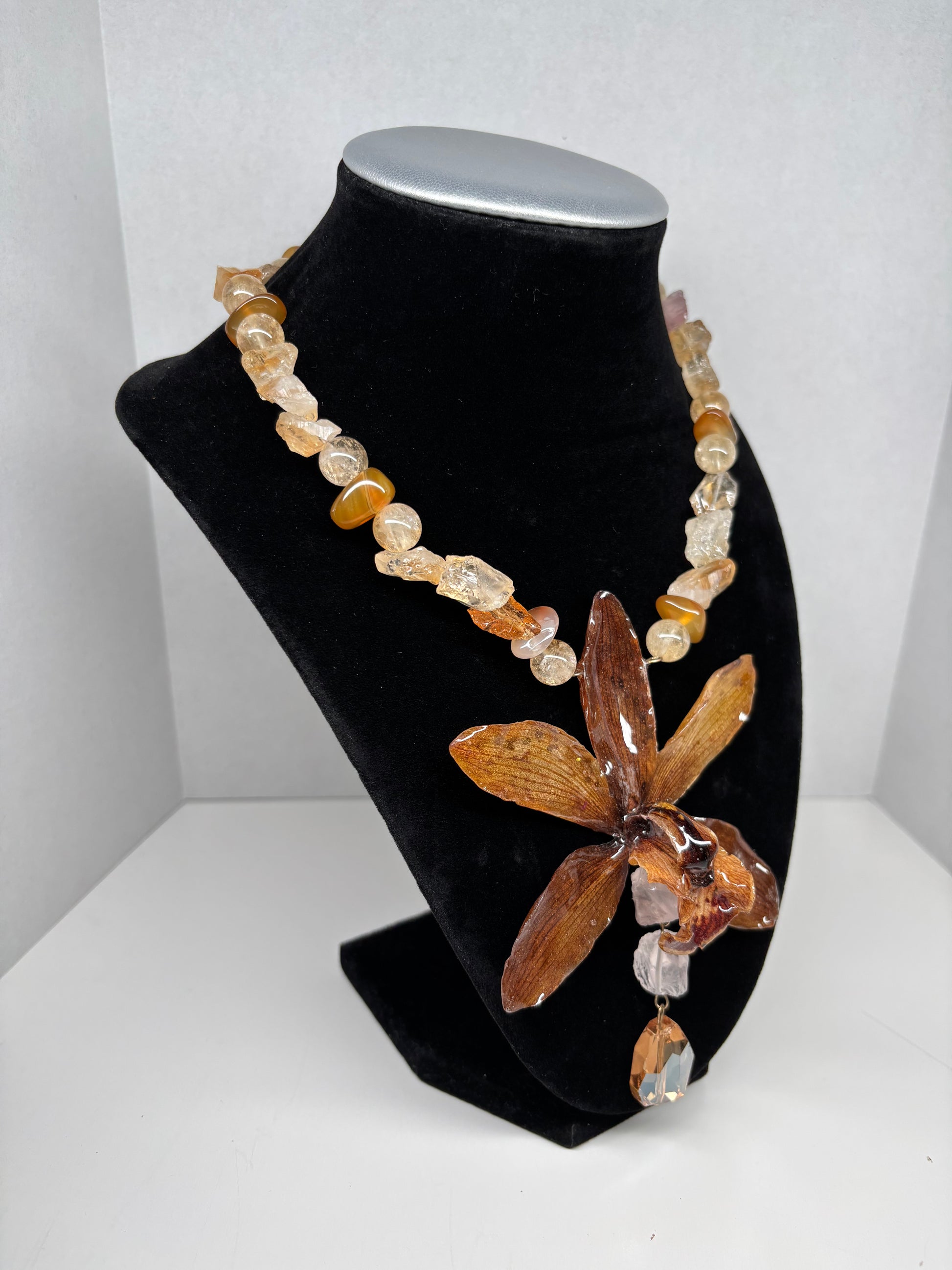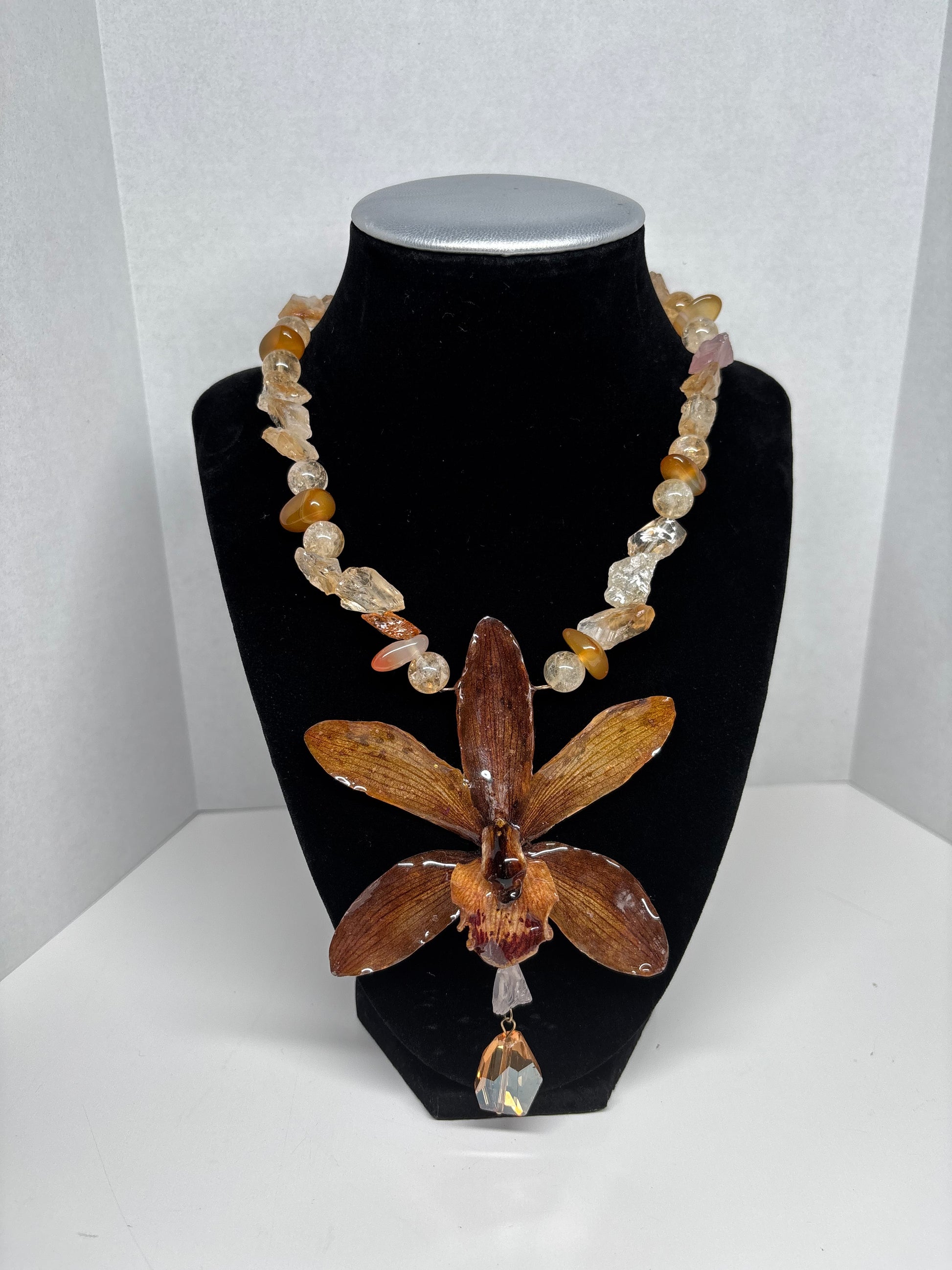 A preserved tan orchid takes center stage in this fully crystal-beaded necklace, accented with luminous Citrine and Clear Quartz. Citrine brings abundance and creativity, while Clear Quartz amplifies clarity and light. Together, they create a piece that glows with positivity, prosperity, and inner strength.