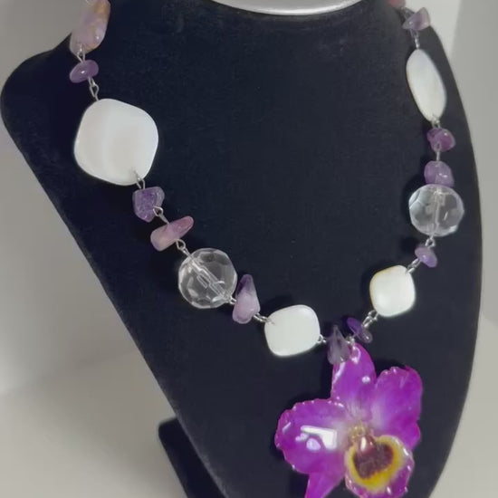 A delicate fusion of light and spirit, this necklace brings together a purple and yellow orchid with soothing amethyst, soft glass beads, and luminous white nácar. With silver hardware for a clean, ethereal finish, it speaks of harmony, transformation, and quiet nower.