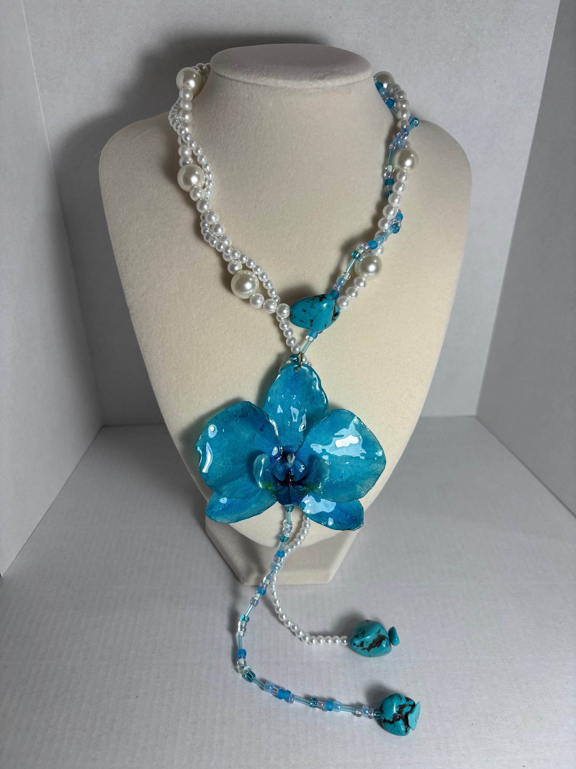 Cool and captivating, this piece features a preserved blue orchid at its center, surrounded by luminous pearls and ocean-toned blue beads. Finished with elegant gold hardware, it’s a graceful blend of serenity and sophistication—like wearing a piece of the sea.