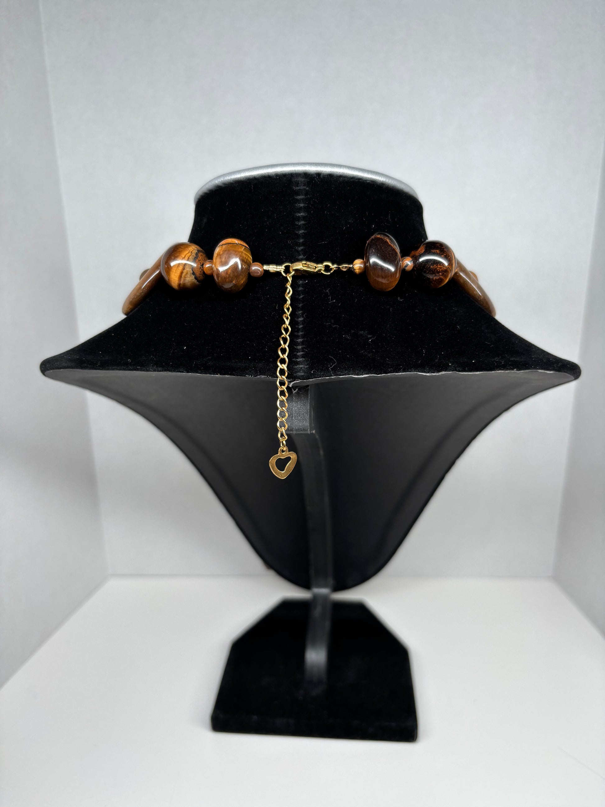 * Interspersed are flat, disc-shaped beads with a central opening, also in the warm brown and golden-brown tones of Tiger's Eye, adding a contemporary geometric element.