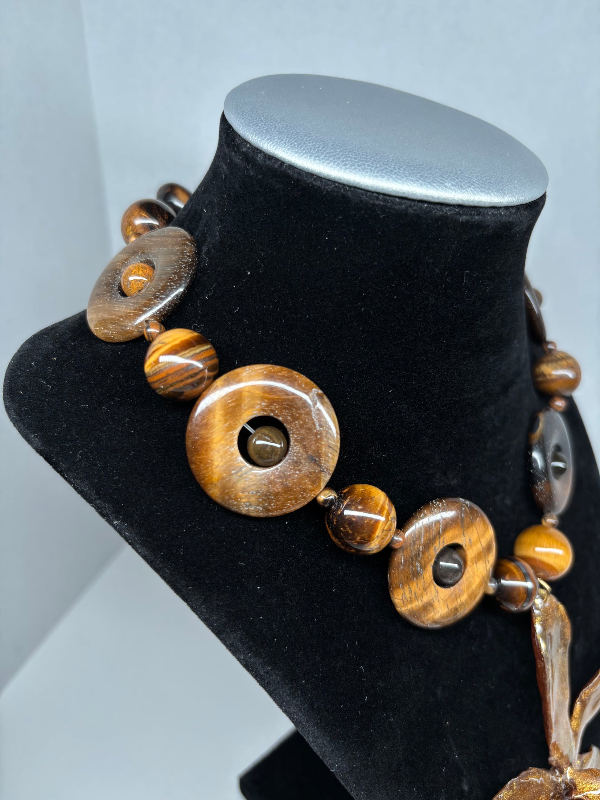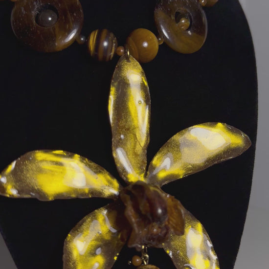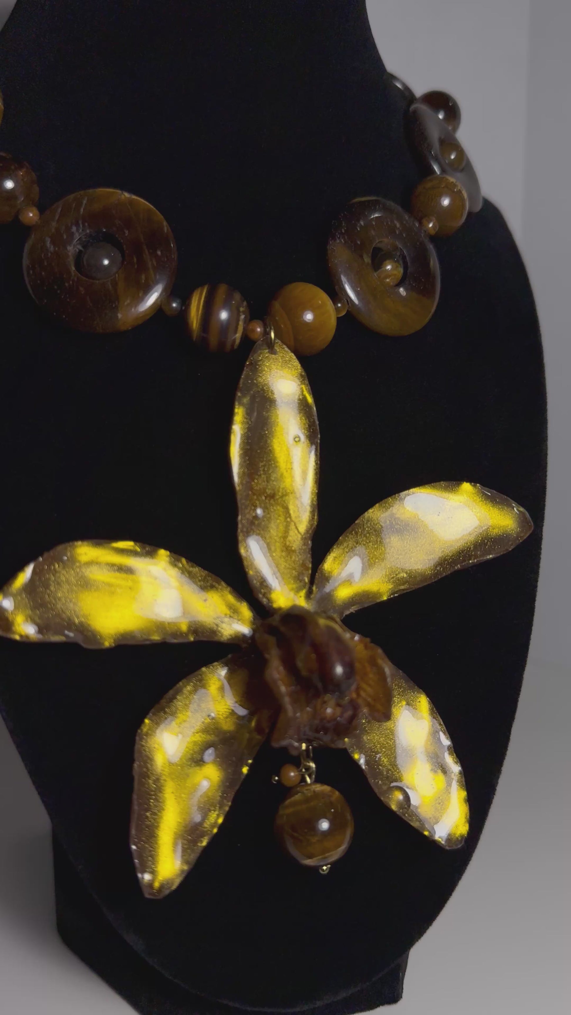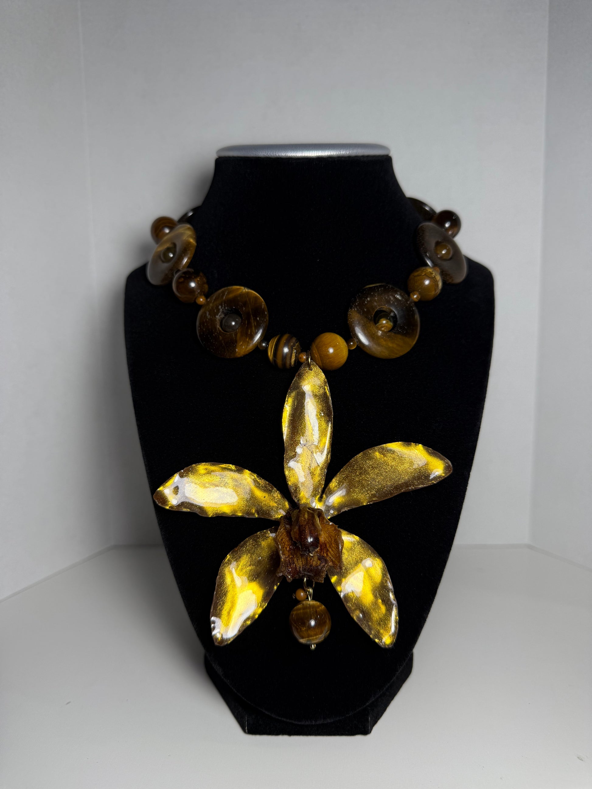 Unleash your wild side with this captivating necklace, featuring a striking, oversized orchid that immediately commands attention. The orchid is a dynamic blend of rich, deep gold and warm brown, accented with bold strokes of white, giving it a textured and almost painted appearance, crafted from resin. A small, coordinating round bead in a striped golden-brown hue tiger's eye, dangles from its base.