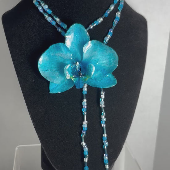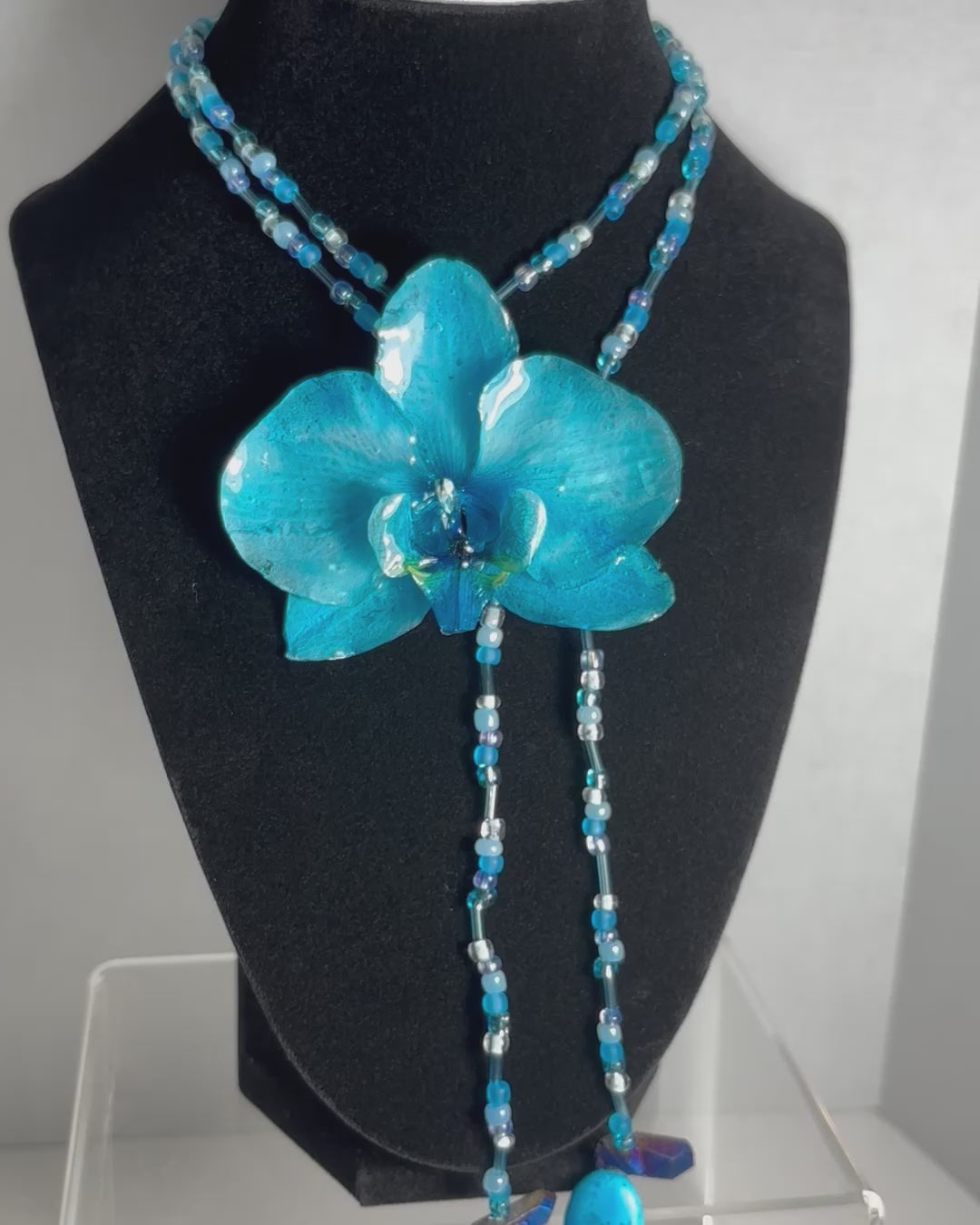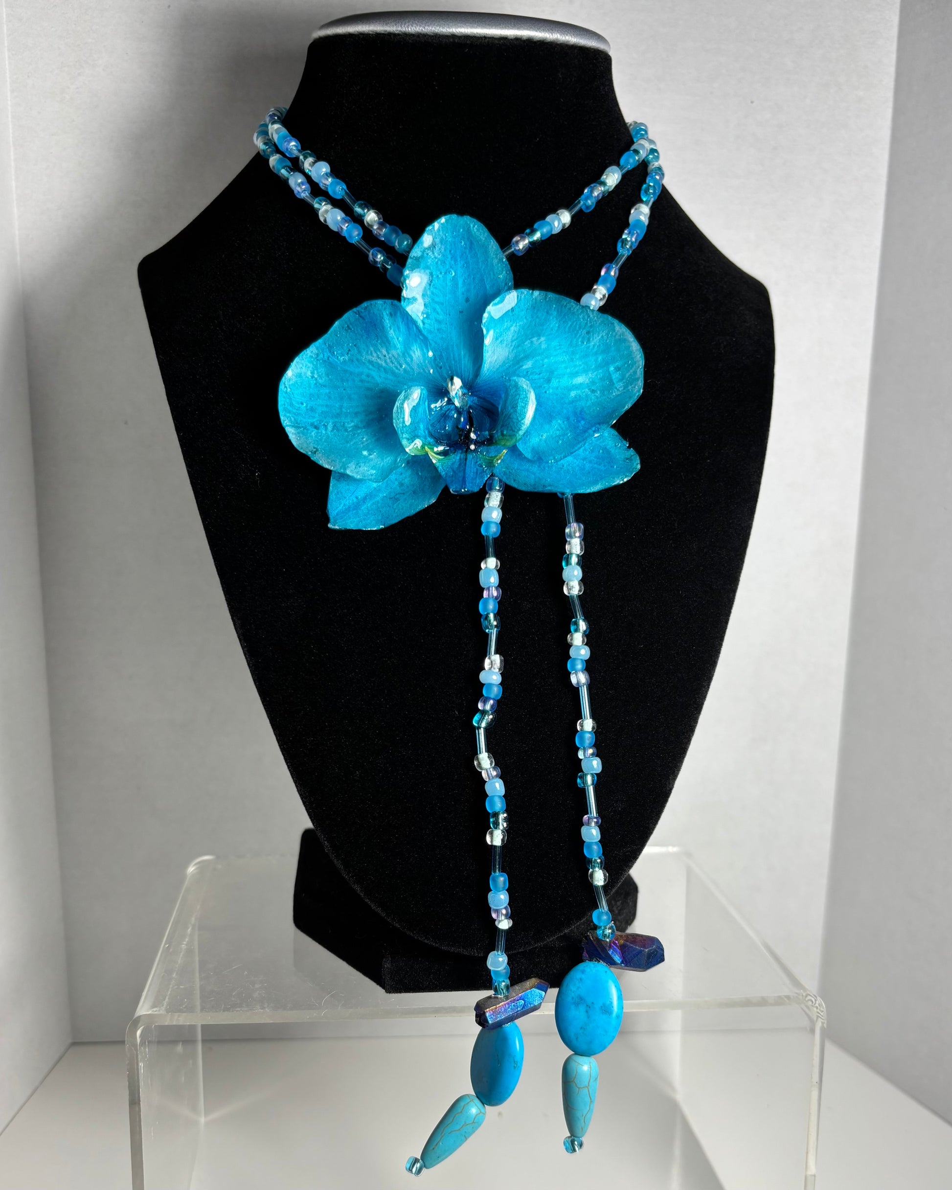 A rare blue orchid rests at the center, paired with soft blue beads and a shimmering turquoise crystal-each element whispering calm and clarity. Silver hardware completes the look, adding a cool touch to this fresh, ocean-inspired piece. A statement of grace, serenity, and inner peace.
