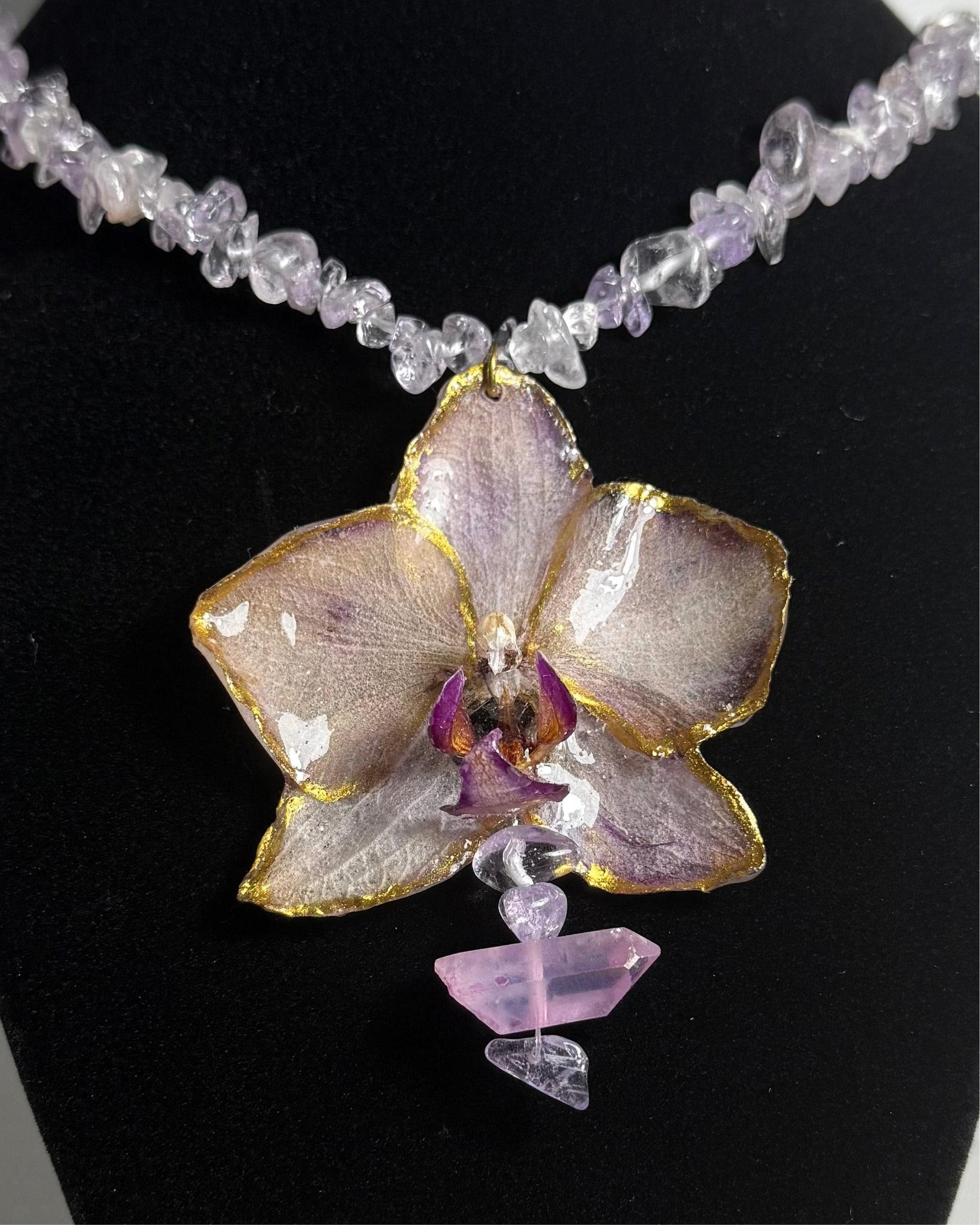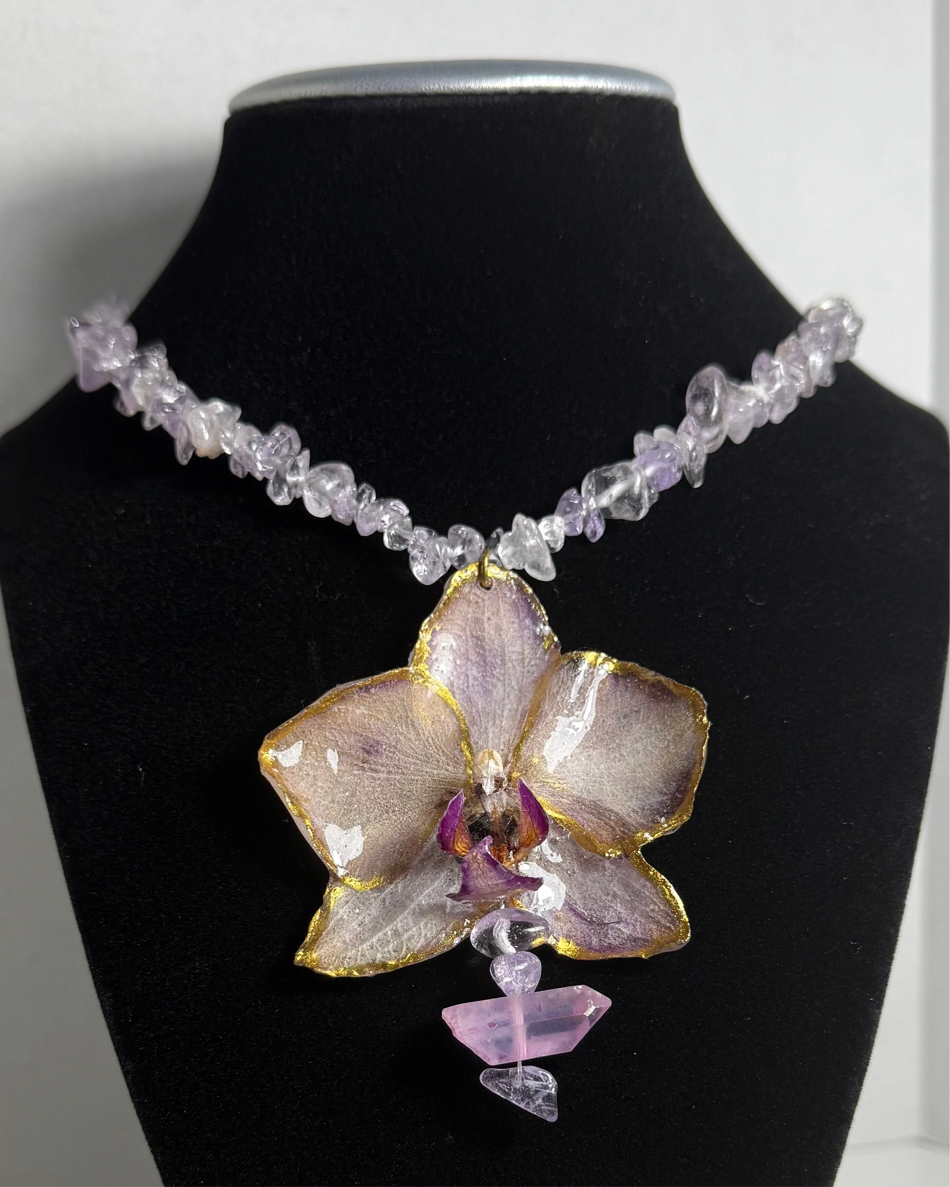 Sophisticated and vibrant, this full set exudes elegance through rich amethyst, luminous quartz, and a vivid orchid bloom.