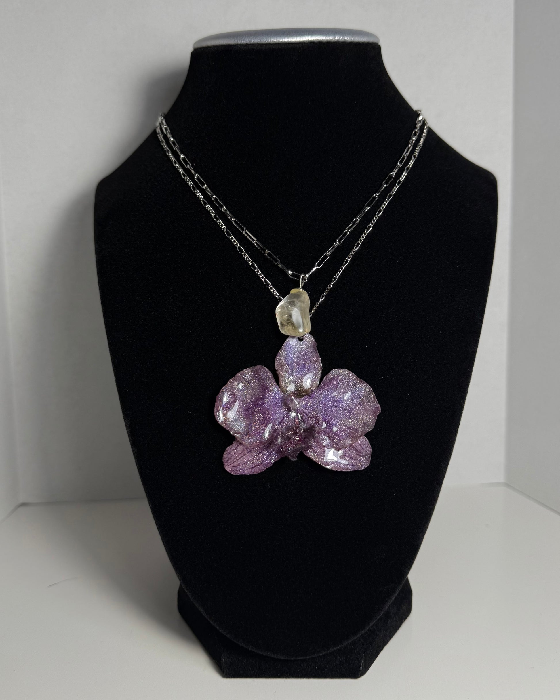 A futuristic twist on natural beauty—this orchid sparkles with a holographic finish, paired with a citrine charm and silver elements.