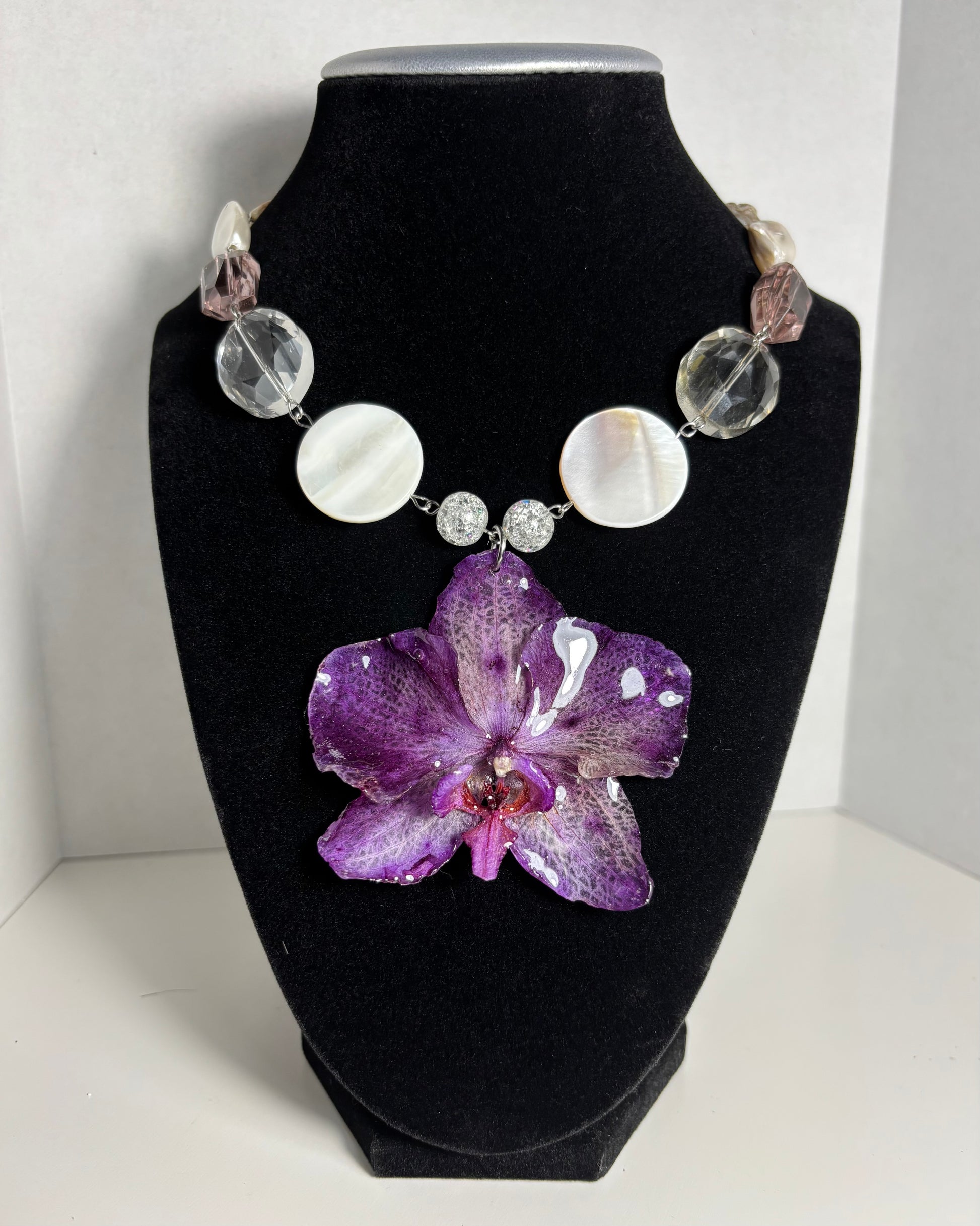 A bold orchid centerpiece with sparkling crystal beads and silver detailing—luxury meets edge.