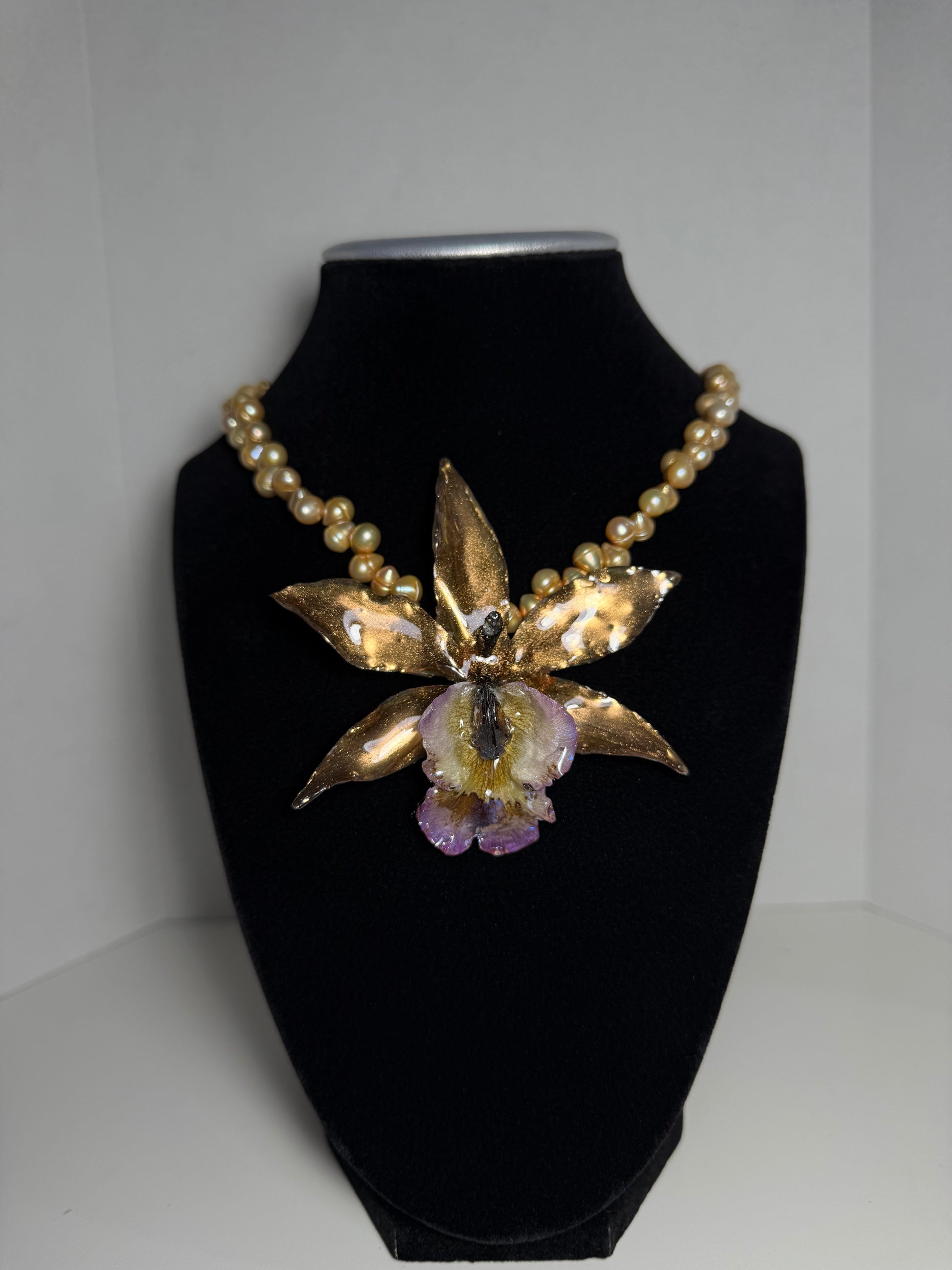 The commanding pendant is elegantly suspended from a classic strand of lustrous, golden, champagne-hued pearls, which perfectly complement the warm tones of the orchid. The smooth, spherical pearls add a touch of timeless sophistication to the bold centerpiece.
