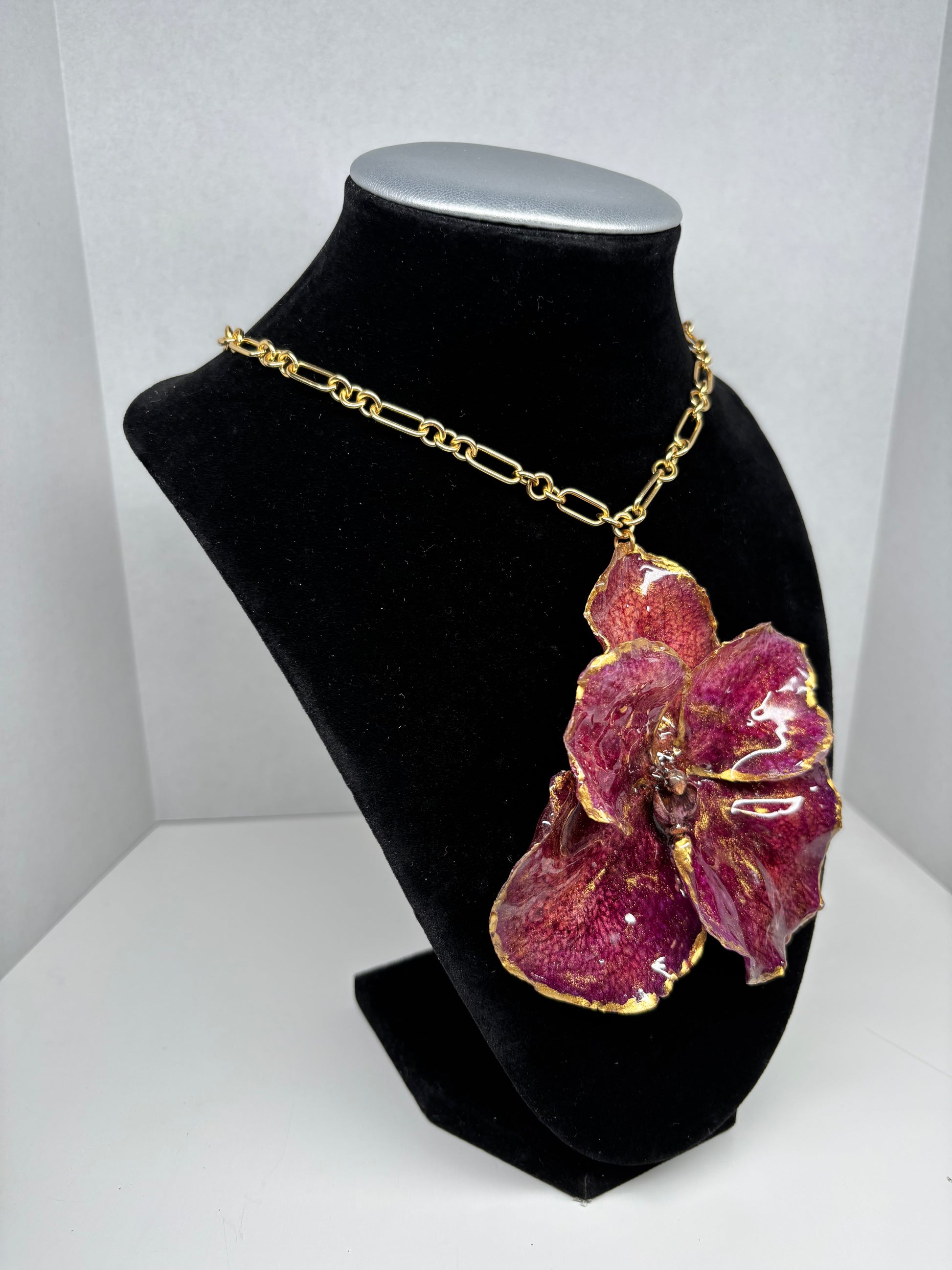 Make a grand statement with this opulent necklace, featuring a magnificent, oversized orchid that immediately captures the eye. The orchid boasts a rich and dramatic color palette of deep, regal magenta and plum, accented with shimmering gold flakes or metallic veins that highlight its intricate details and edges, giving it a luxurious, almost gilded appearance. The texture suggests a polished, resin-encased natural flower.