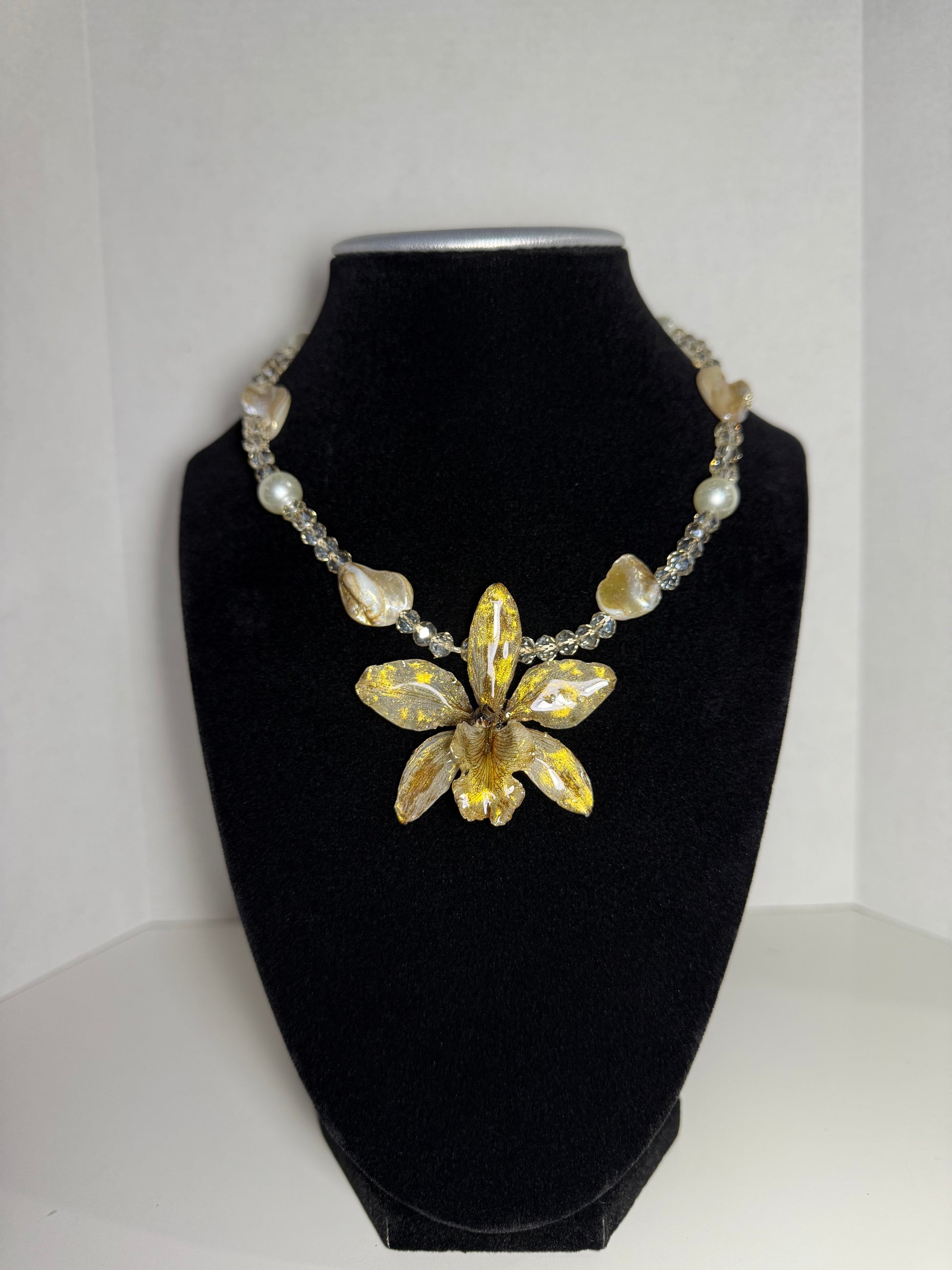 Gleam with sunny sophistication in this captivating necklace, featuring a striking oversized orchid that radiates warmth. The orchid petals boast a vibrant blend of golden yellow and earthy brown, with an almost metallic shimmer in places, and subtle white accents, a preserved bloom crafted in resin.