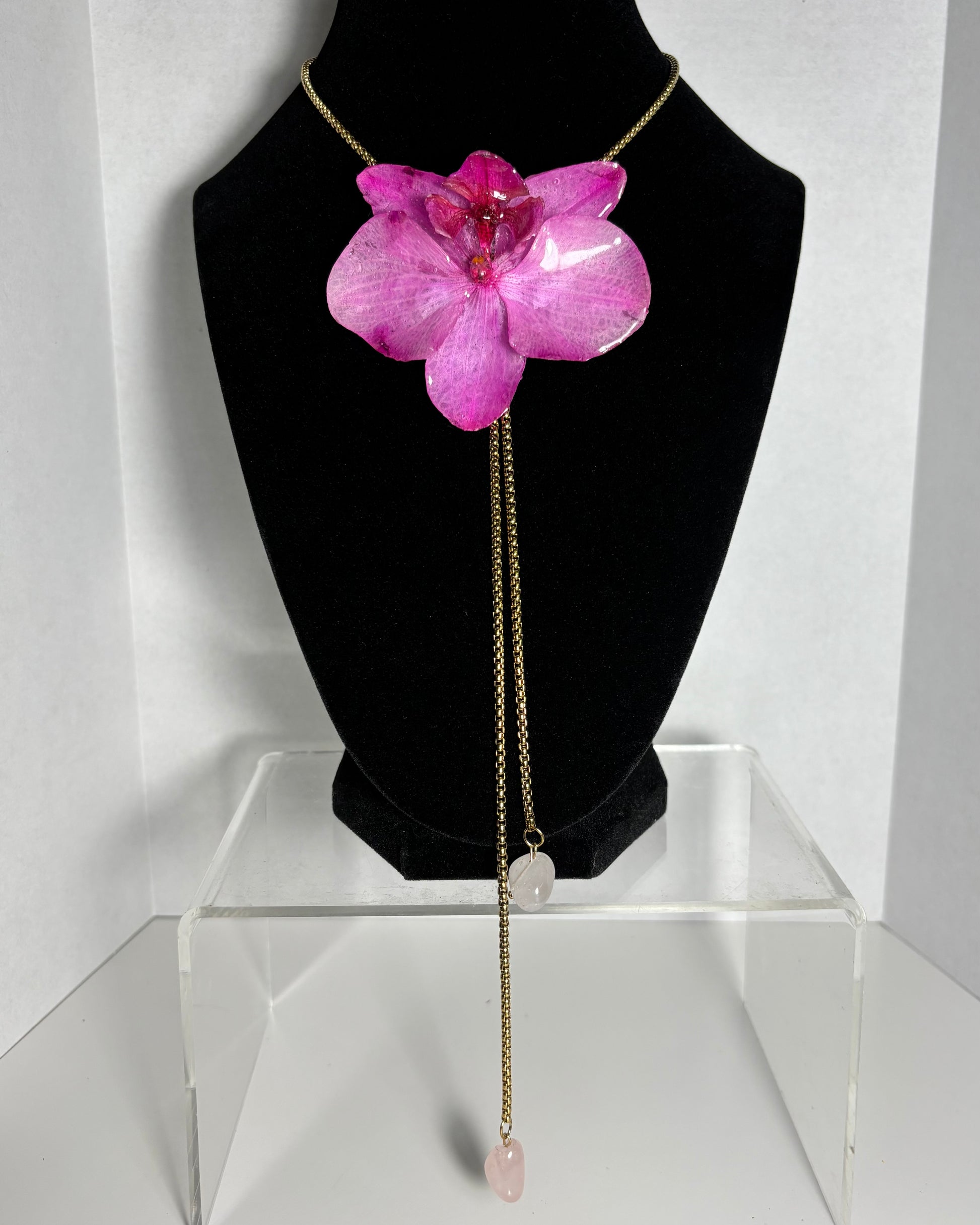 Sweet and spiritual, this pink orchid radiates love and clarity through its blend of rose and clear quartz.