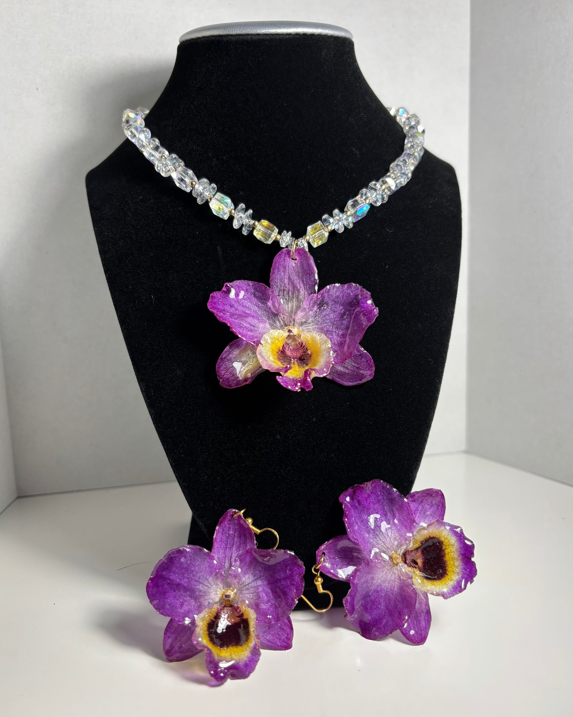 A full set of dreamy sparkle and bloom—iridescent beads and a two-tone Catalaya orchid with perfectly paired earrings.