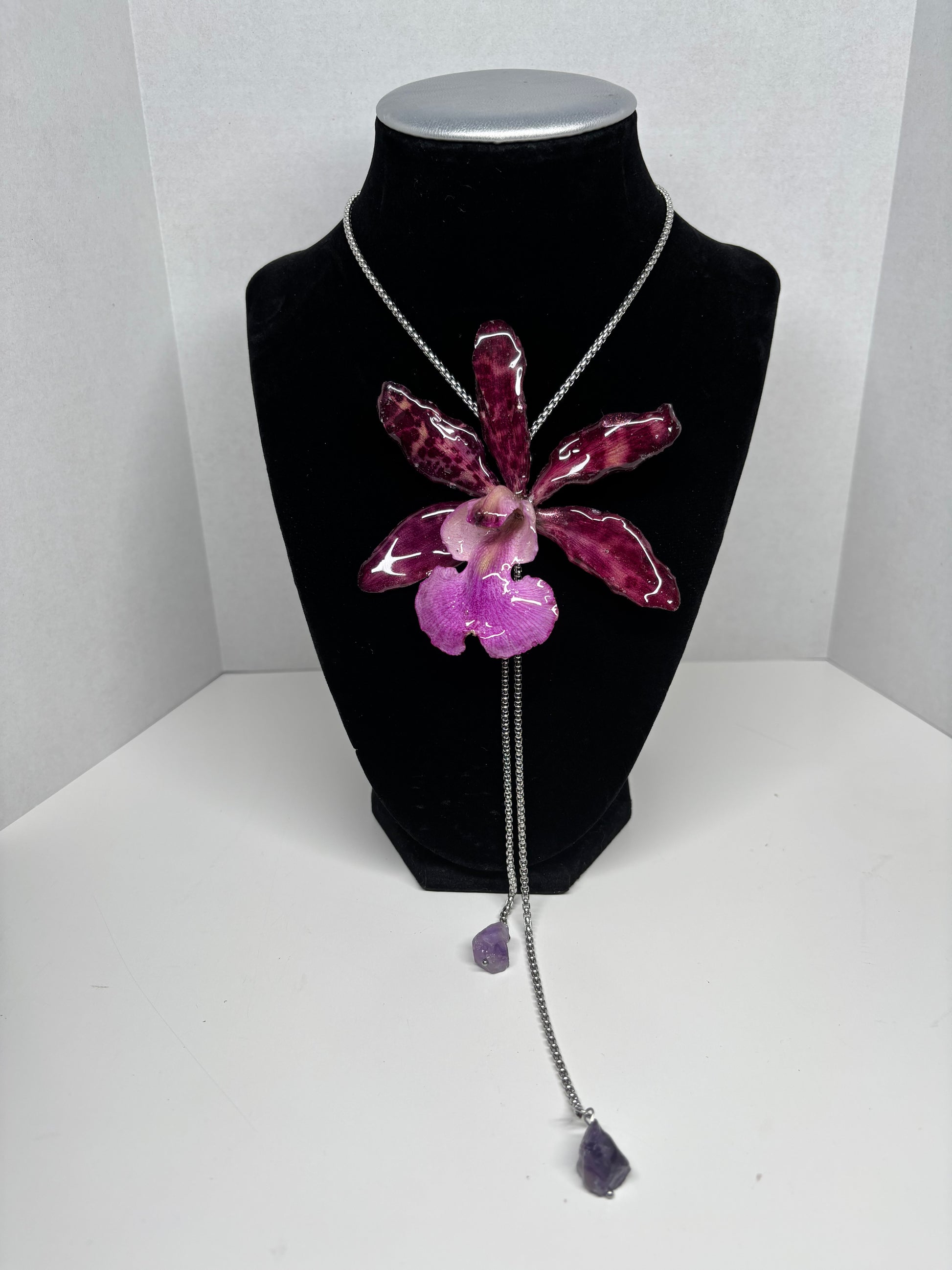 A preserved maroon-and-purple orchid with intricate spotting is paired with Amethyst, the stone of peace and intuition. This elegant combination symbolizes wisdom, self-discovery, and inner balance. Set with silver hardware for a modern, reflective finish, this piece is perfect for channeling calm strength and spiritual growth.