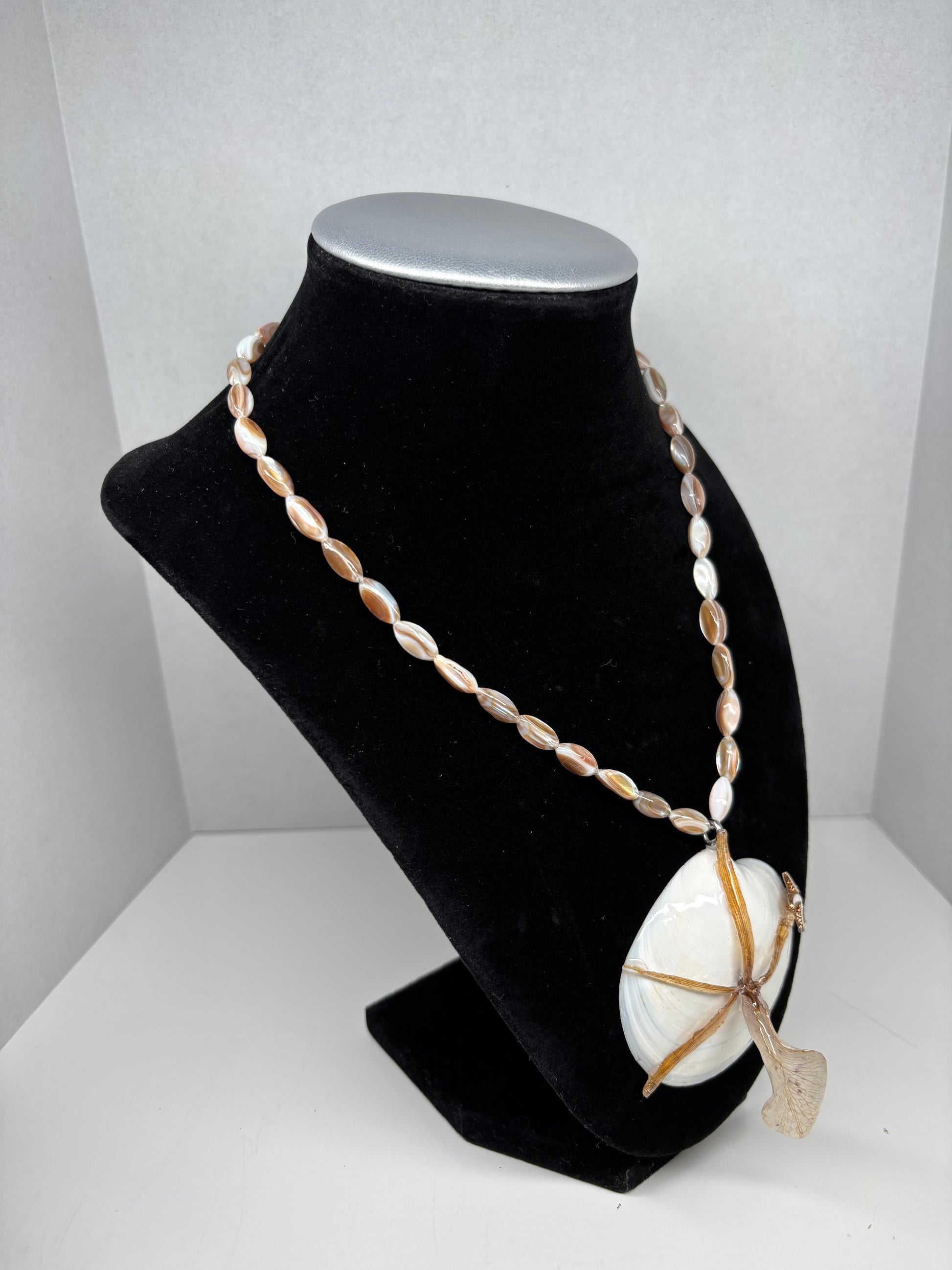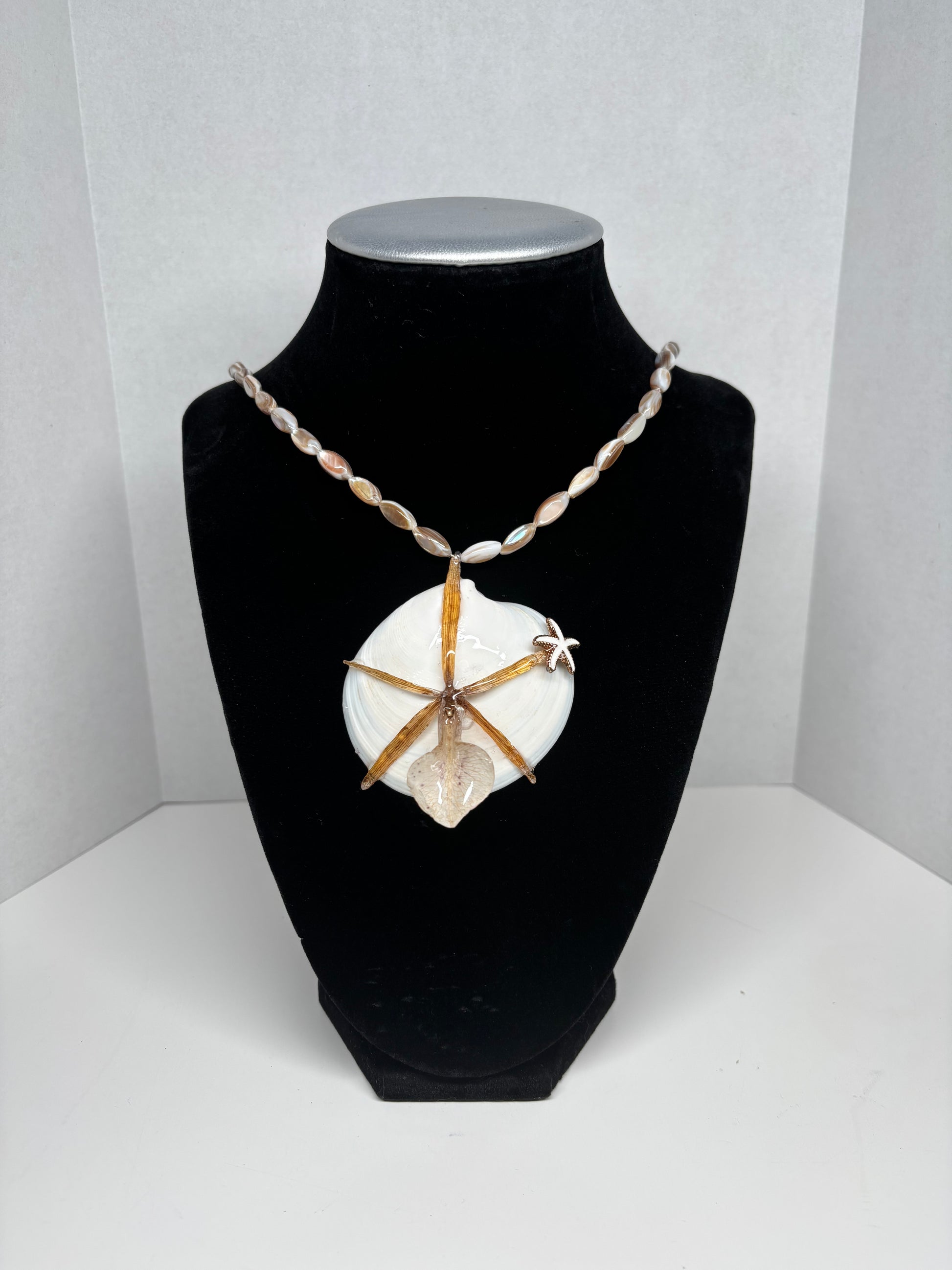 A preserved exotic orchid is paired with a natural white shell centerpiece and a delicate starfish charm, symbolizing renewal, resilience, and the magic of the sea. The silver hardware enhances its soft luster, reflecting balance and clarity. This necklace evokes the serenity of ocean waves and the vibrant beauty of tropical blooms.