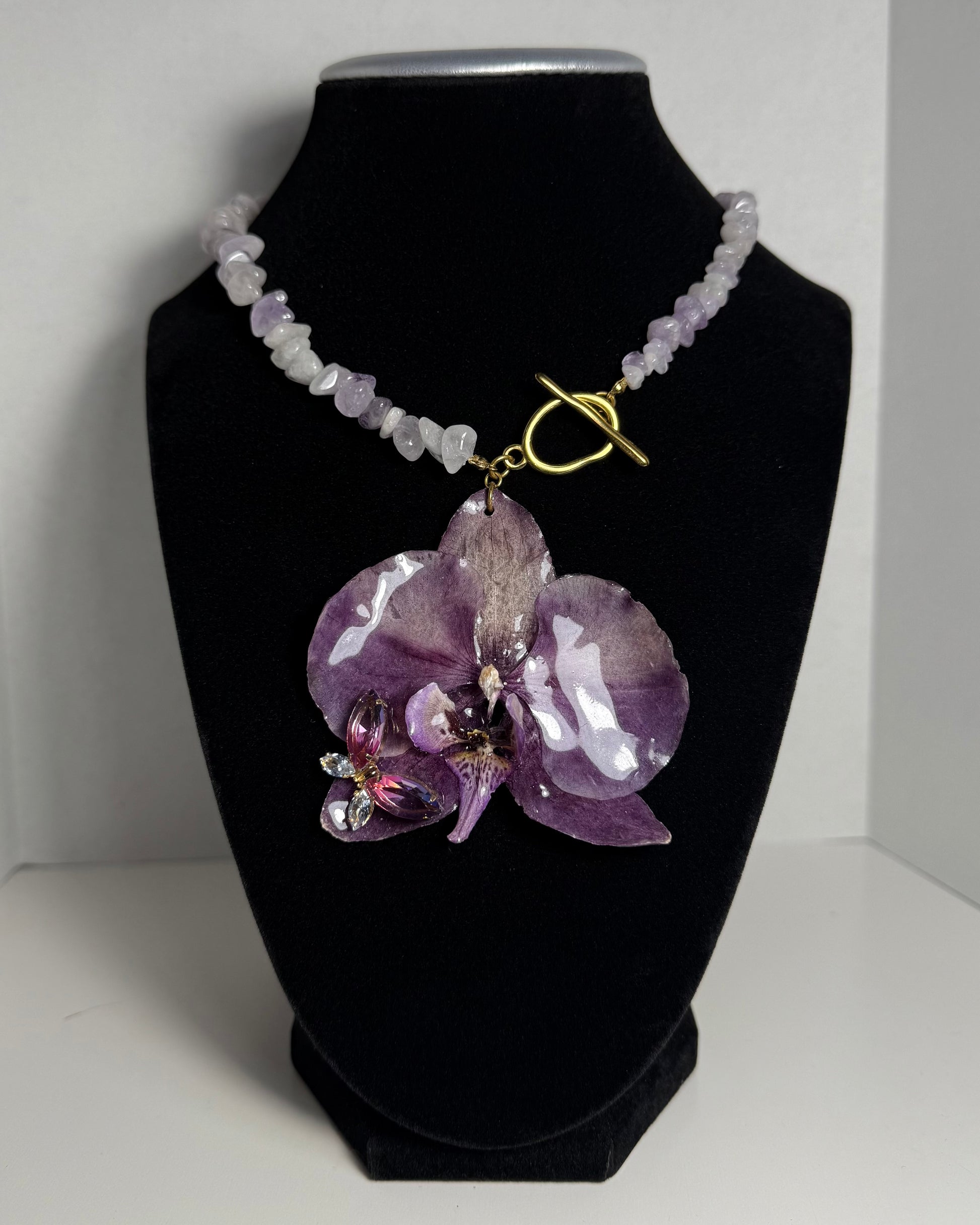 A symbol of transformation and clarity, this necklace features amethyst crystals, a butterfly charm, and a vibrant orchid framed in gold.