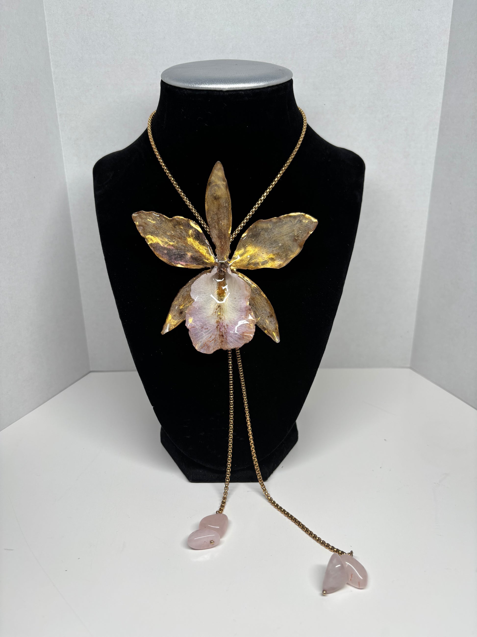 Quartz, the stone of love, compassion, and emotional healing. The flower’s golden hues symbolize abundance and strength, while Rose Quartz radiates tenderness and self-love. Set in luminous gold hardware, this necklace carries both warmth and serenity, making it the perfect heart-centered adornment.