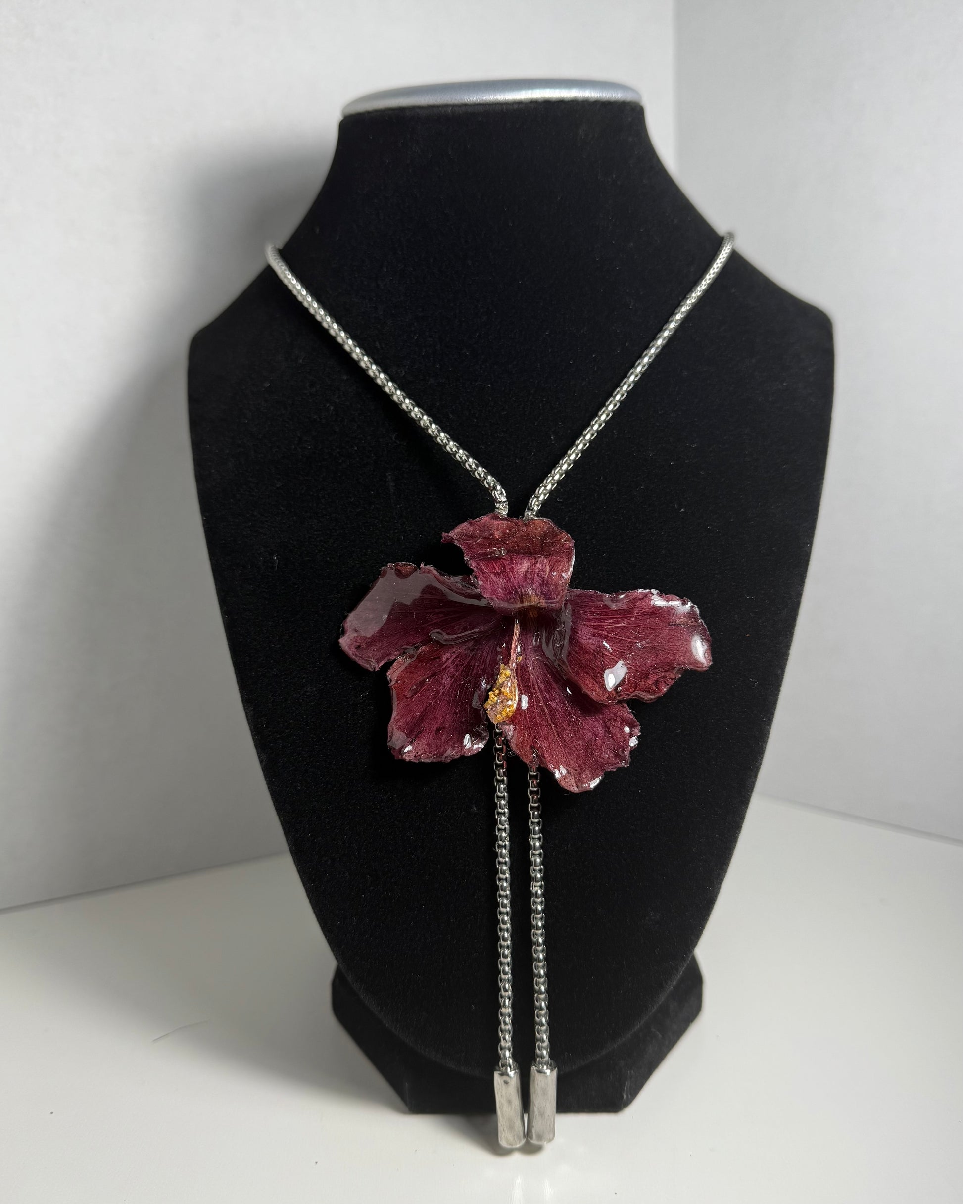 Rich and bold, this preserved maroon hibiscus flower is accented with cool silver for an elegant, standout piece.
