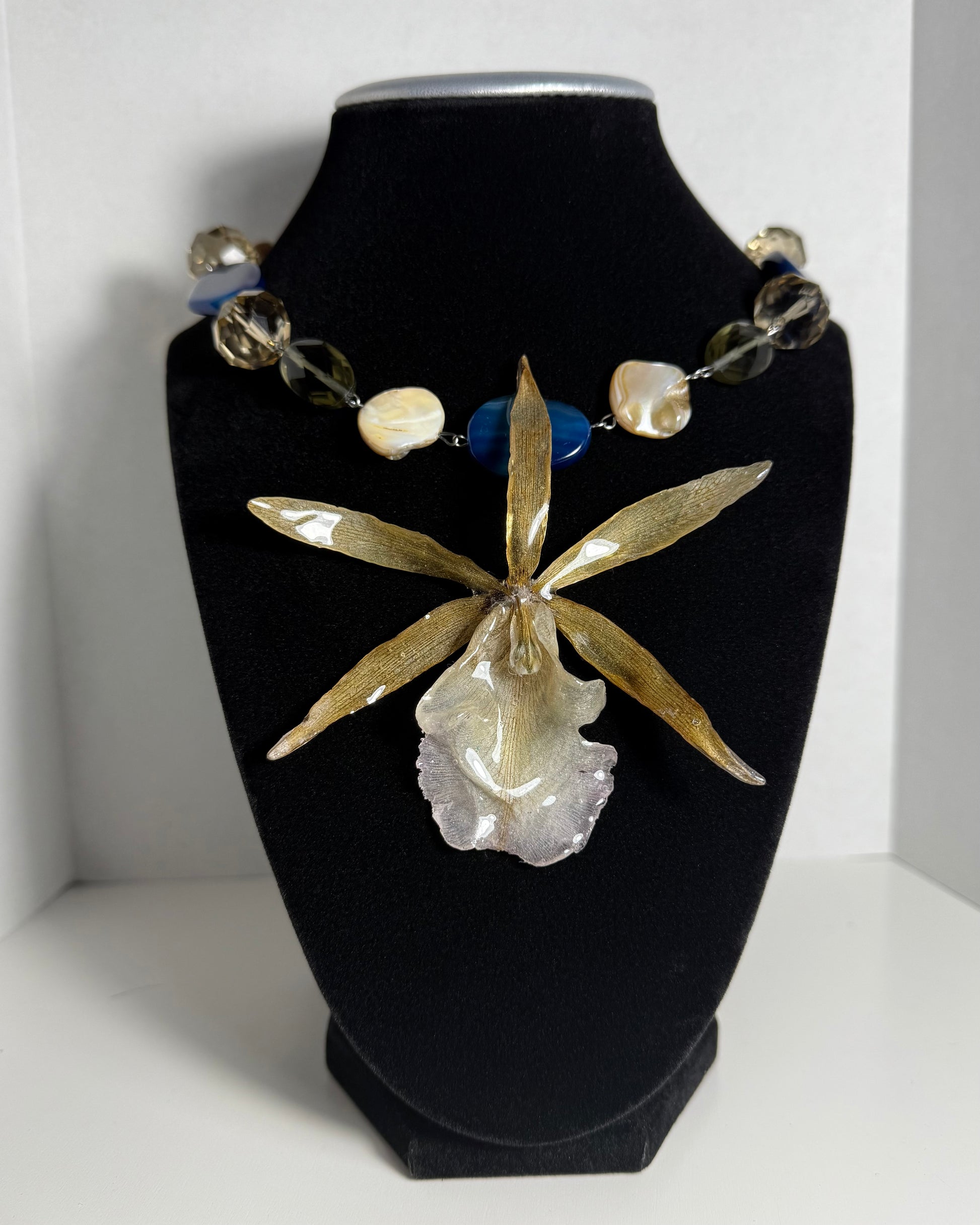 This one-of-a-kind piece features icy blue tones and an elegant tan orchid—a modern fusion of softness and structure.