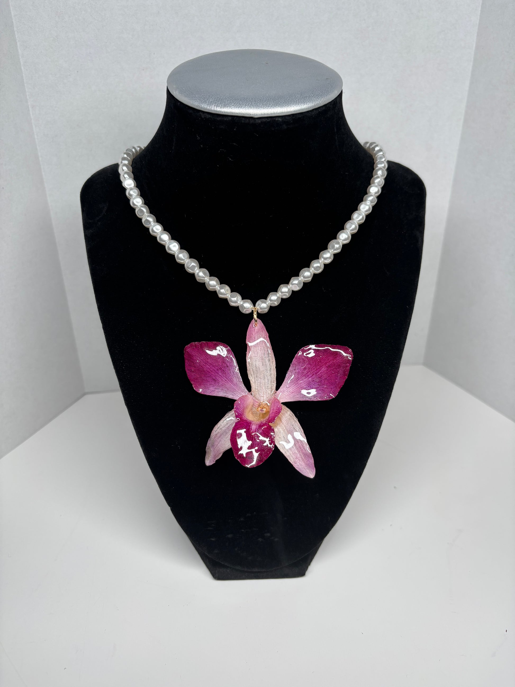 A preserved exotic orchid in fuchsia and white rests delicately among pearl-like beads, creating a piece that symbolizes purity, passion, and divine femininity. The luminous beads mirror elegance and grace, while the orchid infuses the necklace with vibrant life energy. A lightweight yet enchanting design for everyday wear or special occasions.