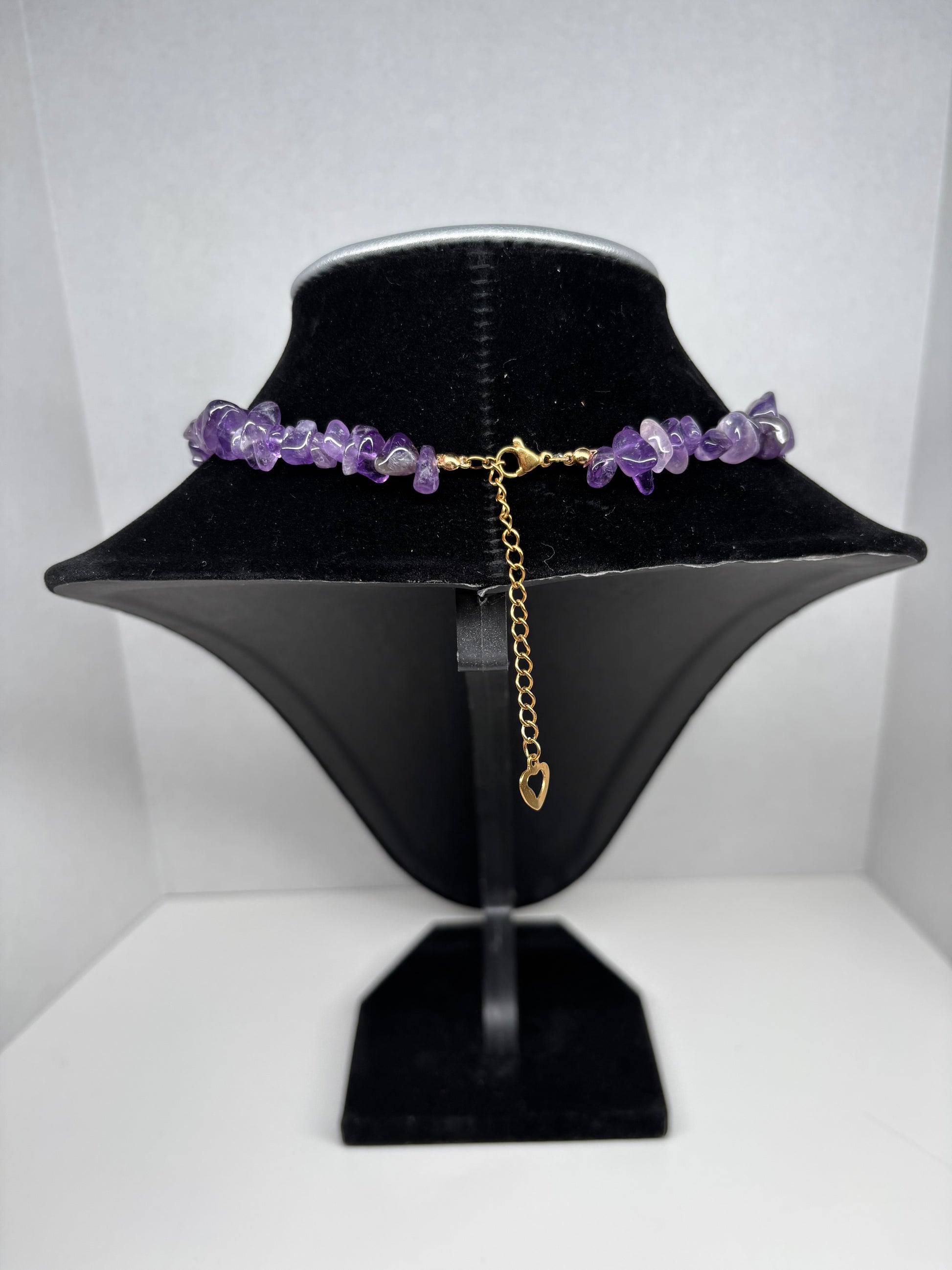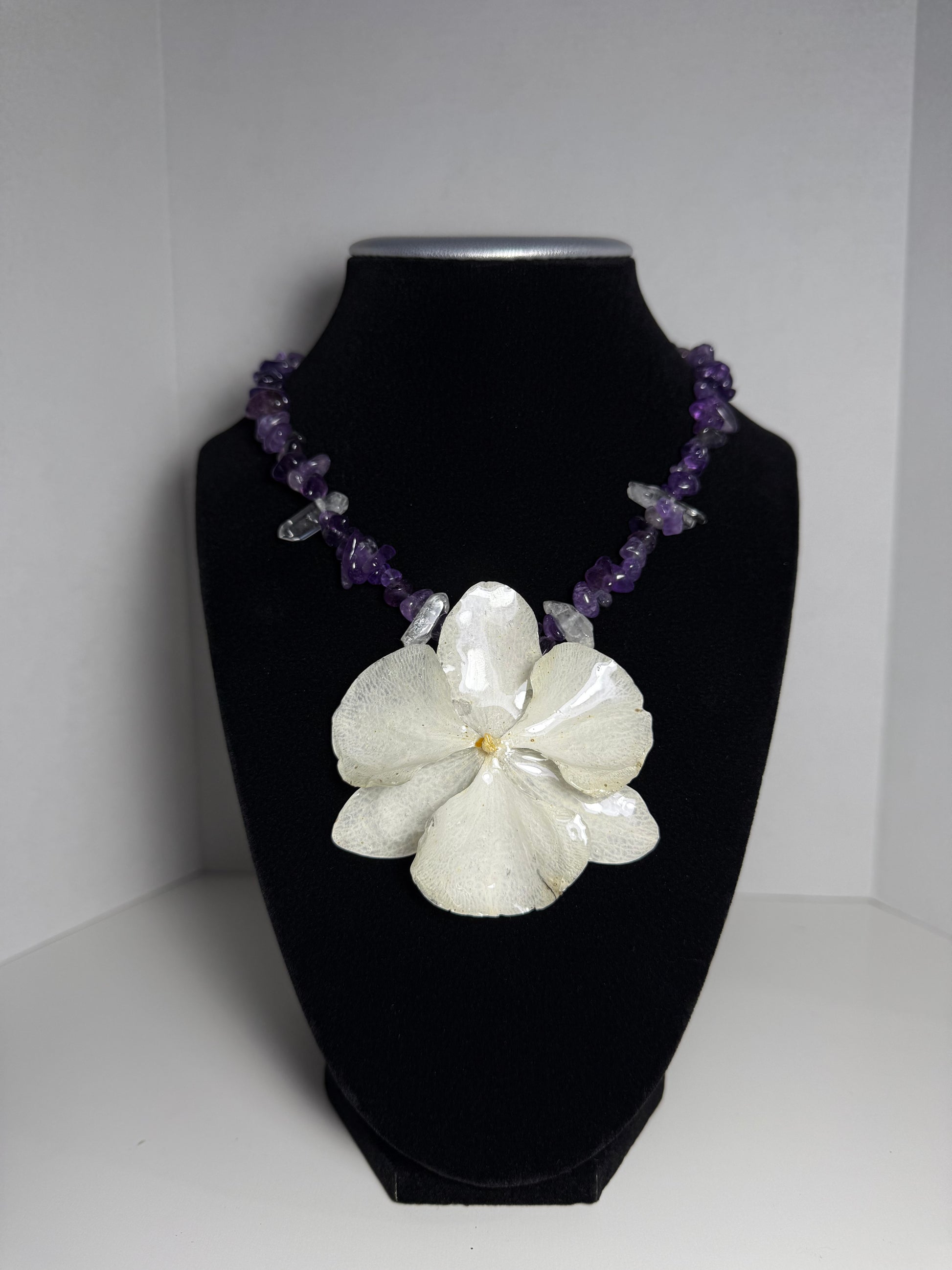 The elegant pendant is suspended from a vibrant chain composed of tumbled gemstone chips in rich shades of purple, amethyst, interspersed with clear or light-colored chips, quartz or, adding a touch of sparkle. This piece beautifully balances natural elegance with a pop of regal color, making it an attention-grabbing addition to any ensemble.