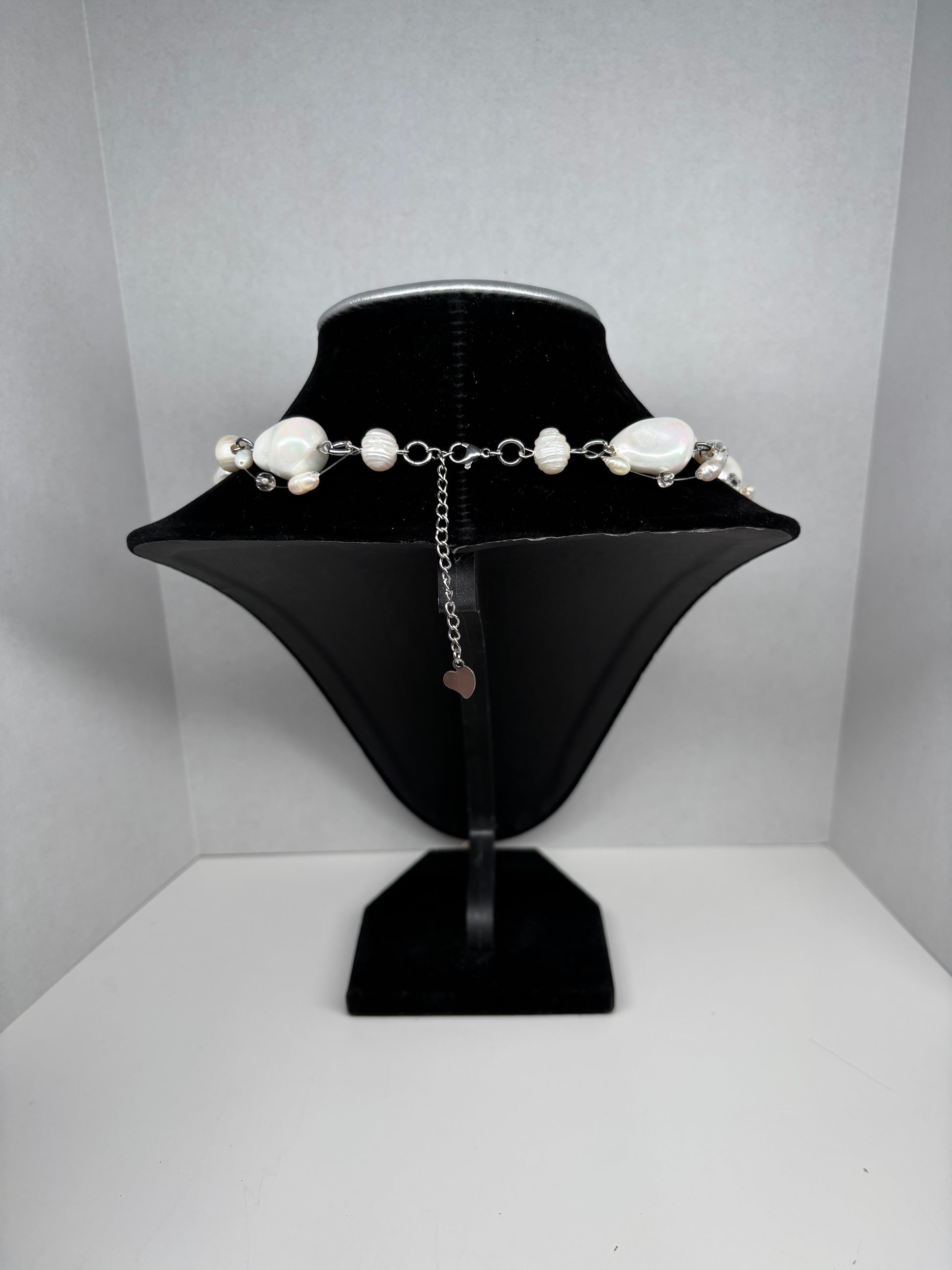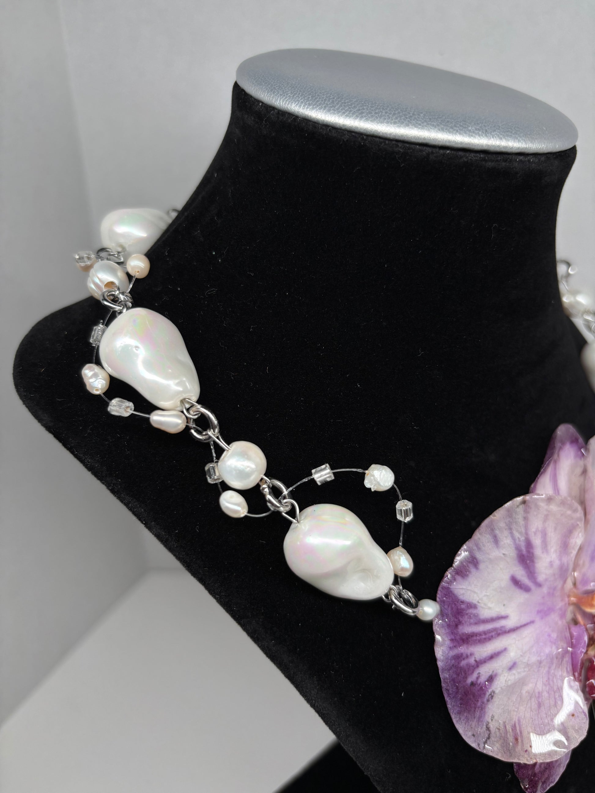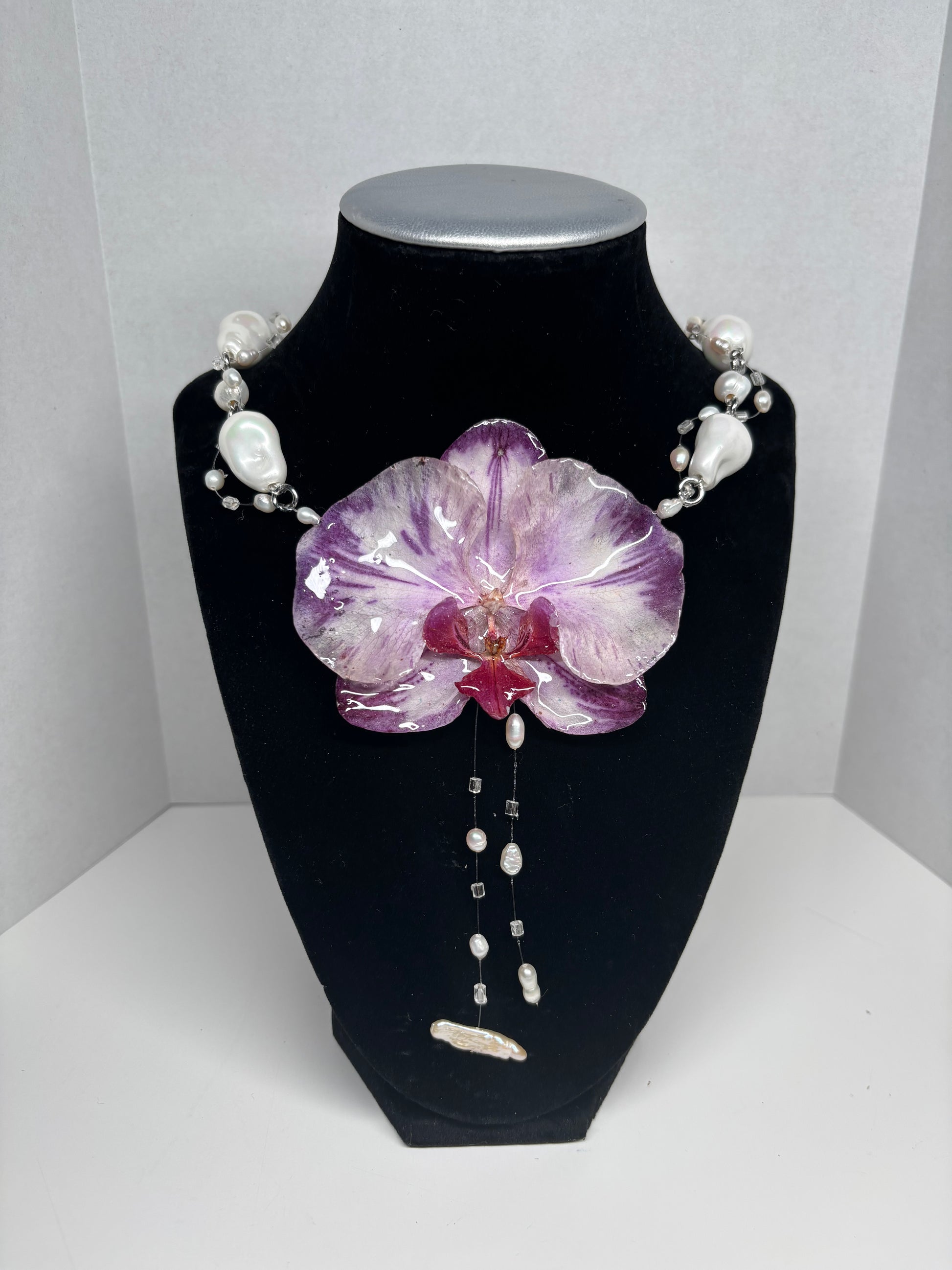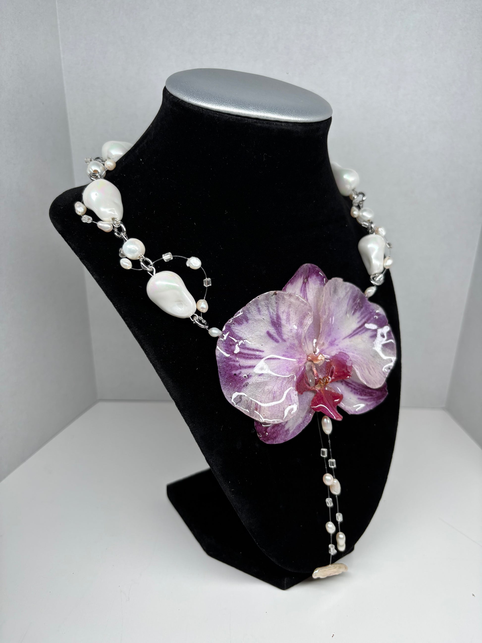 A preserved orchid splashed in white and purple is paired with luminous pearls in an elegant water-drop illusion design. The orchid symbolizes admiration and transformation, while pearls embody wisdom, purity, and tranquility. Finished with silver hardware, this necklace reflects both grace and modern artistry.
