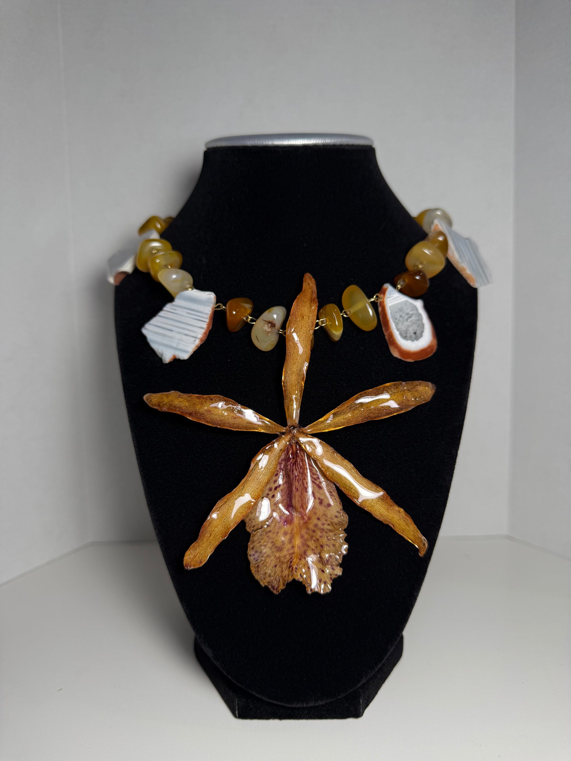 Embrace the allure of nature with this striking necklace, featuring a prominent, elongated orchid pendant in rich, earthy tones of amber and coppery brown, with a deeper reddish-brown and textured pattern in its center, a preserved bloom in resin. The glossy finish adds to its organic appeal.