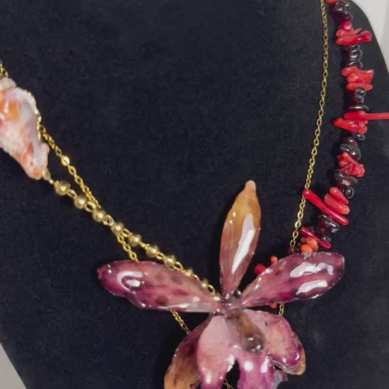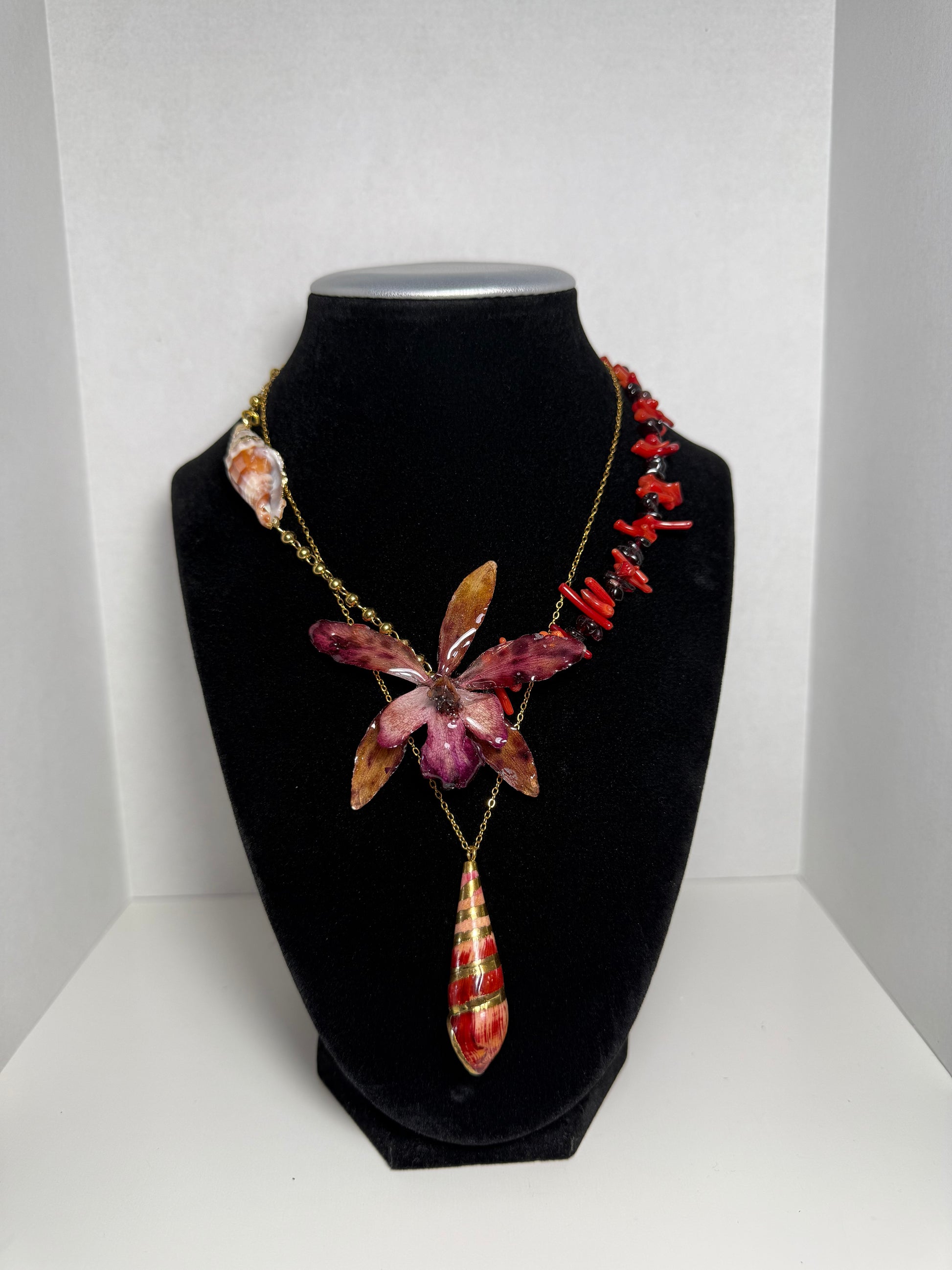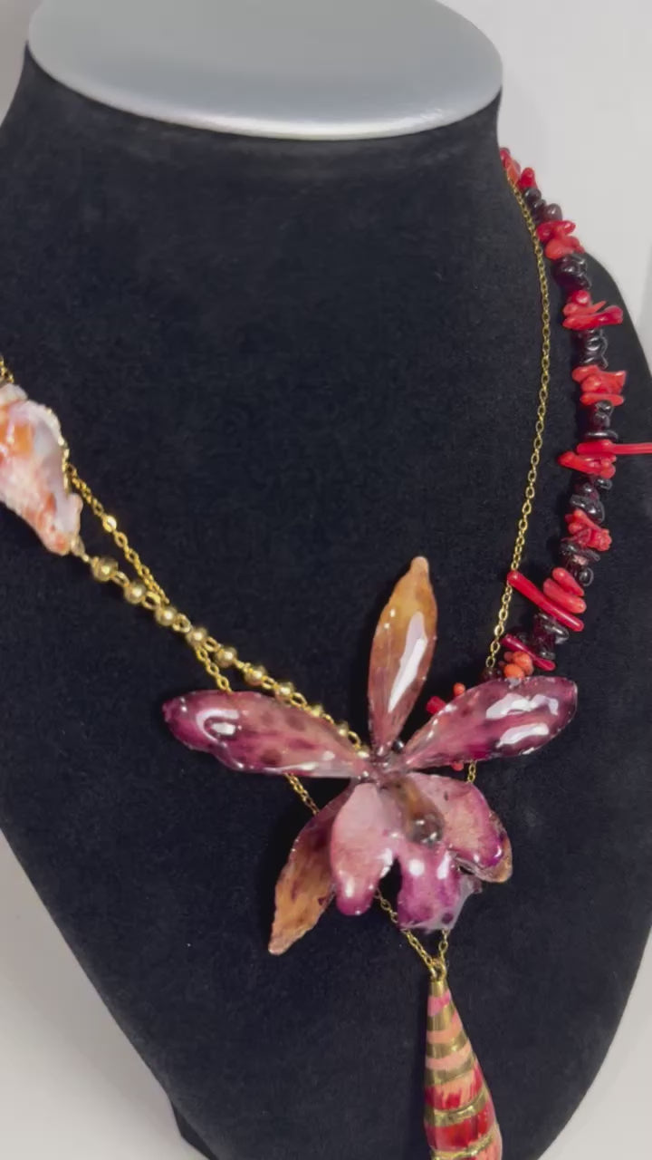 Double the elegance, double the story — Twin Tides is a layered necklace featuring two natural seashells, a beaded side accent, and a rare spotted Cataleya orchid. Made for the ocean lover with a love for balance and beauty.