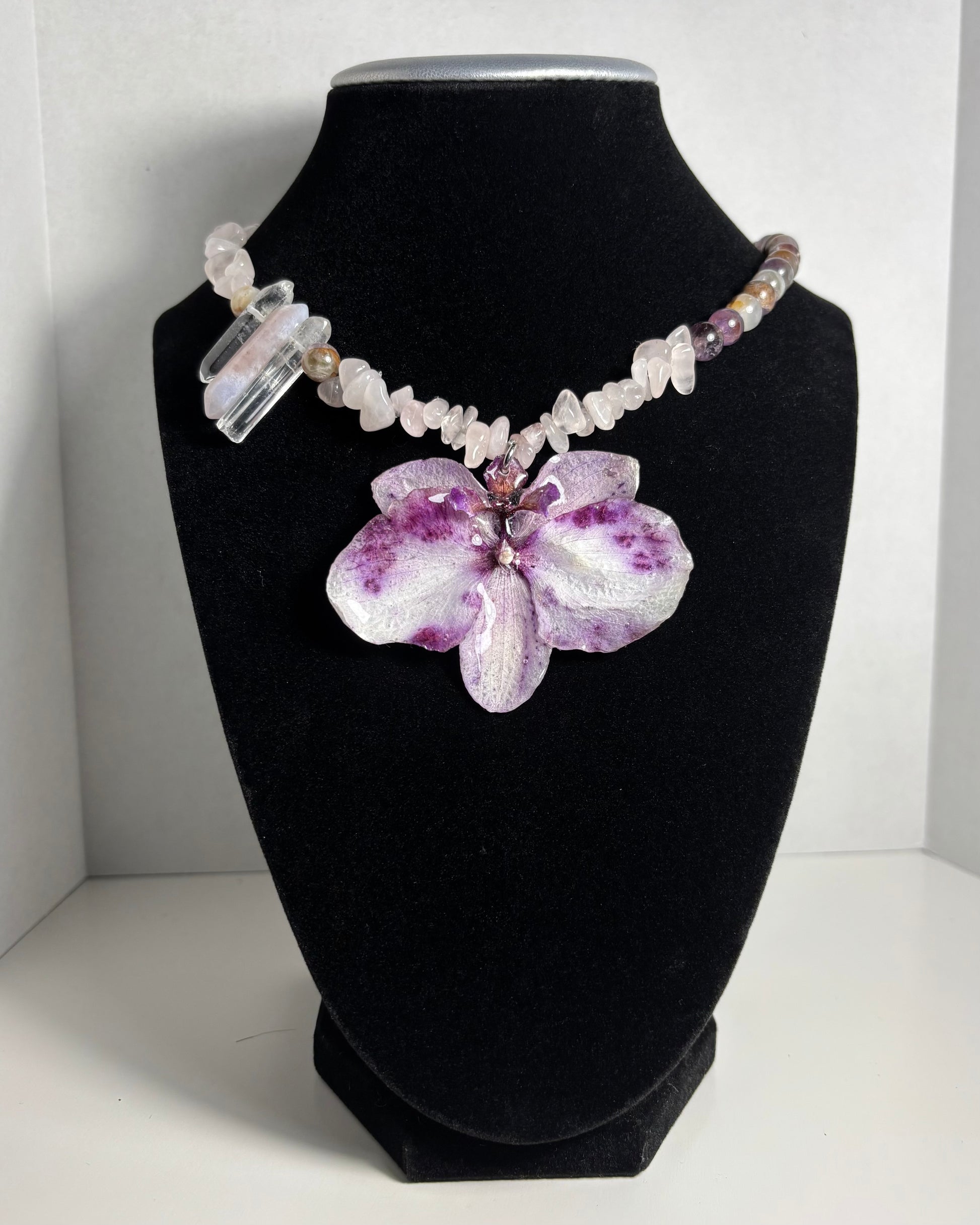 A heart-opening trio of crystals meets a delicate orchid in soft purples and pinks for a calming, spiritual energy.