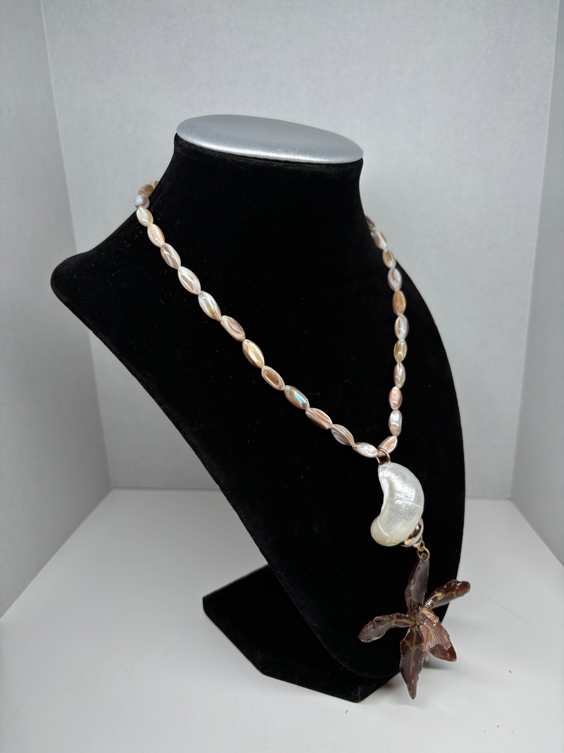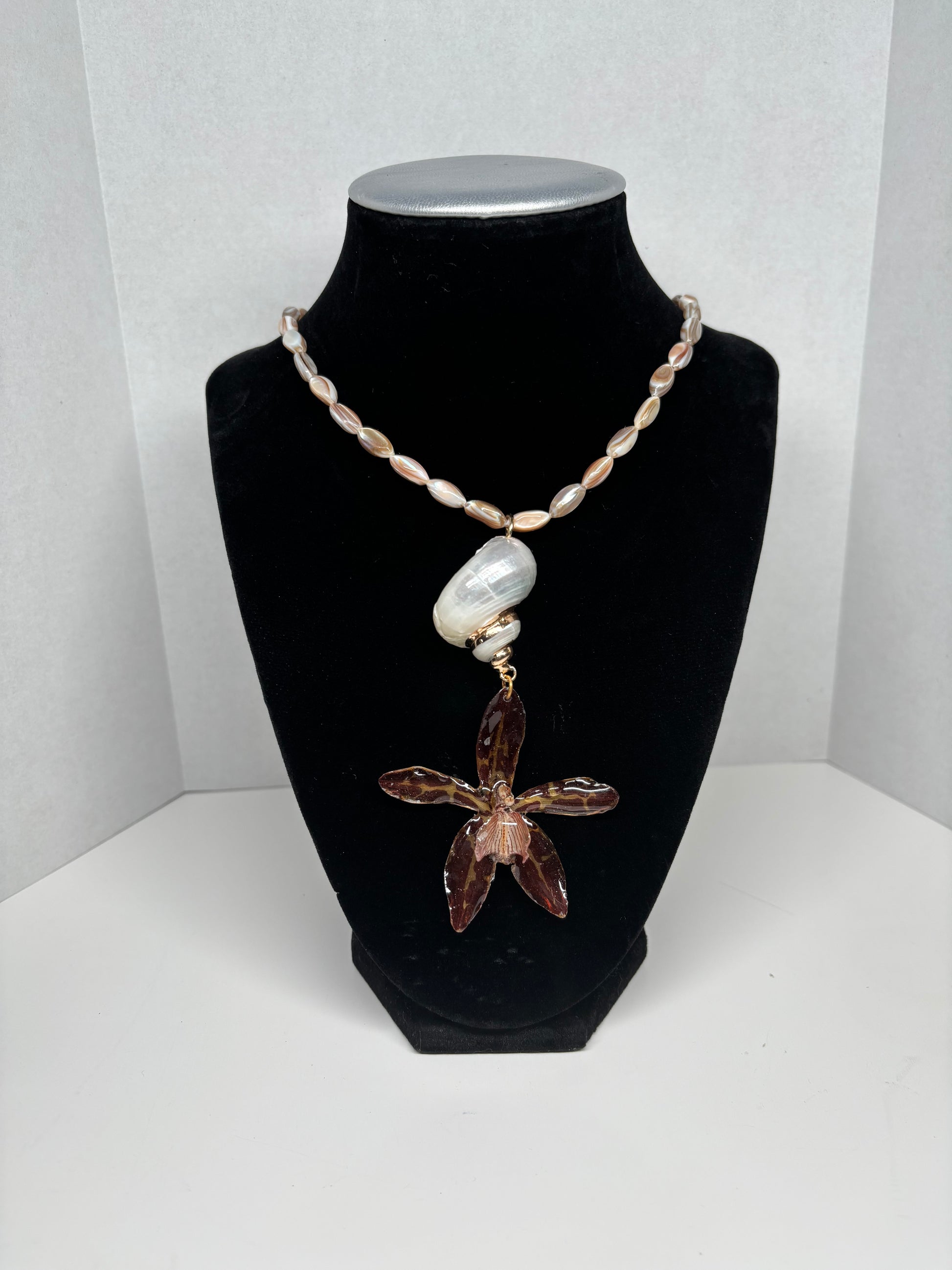 A real preserved cheetah-spotted orchid, symbolizing strength, resilience, and bold beauty, is paired with a natural white shell at its center. The shell radiates purity and harmony, while the orchid’s unique pattern embodies individuality and exotic charm. Finished with gold hardware, this piece captures the essence of natural elegance and grounding energy. Handcrafted for those who wish to carry a touch of the wild with refined grace.